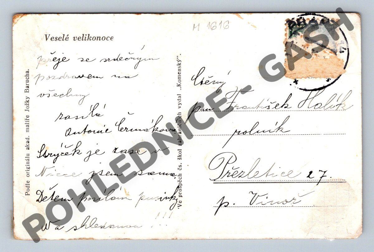 Velikonoční pohlednice s etnografickým motivem pastýře v lidovém kroji, který hraje na píšťalu na pozadí krajiny s pasoucím se stádem ovcí a psem. V pozadí je možno vidět hory a středověký hrad, což navozuje atmosféru tradičního venkova. Barevný tisk podle originálu ak. malíře Jožky Barucha. Na zadní straně ručně psaný velikonoční vzkaz a adresace, prošlá poštou. Pohlednice je zřejmě vydaná v první polovině 20. století, má drobné známky opotřebení odpovídající stáří (otřepané rohy, skvrny). Krásná ukázka lidového umění a tradic. Ideální pro sběratele etnografických pohlednic či milovníky starých lidových zvyků a Velikonoc.