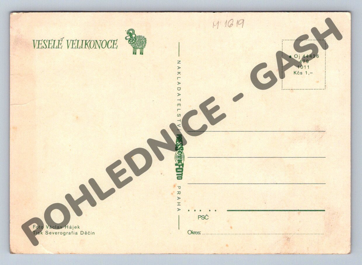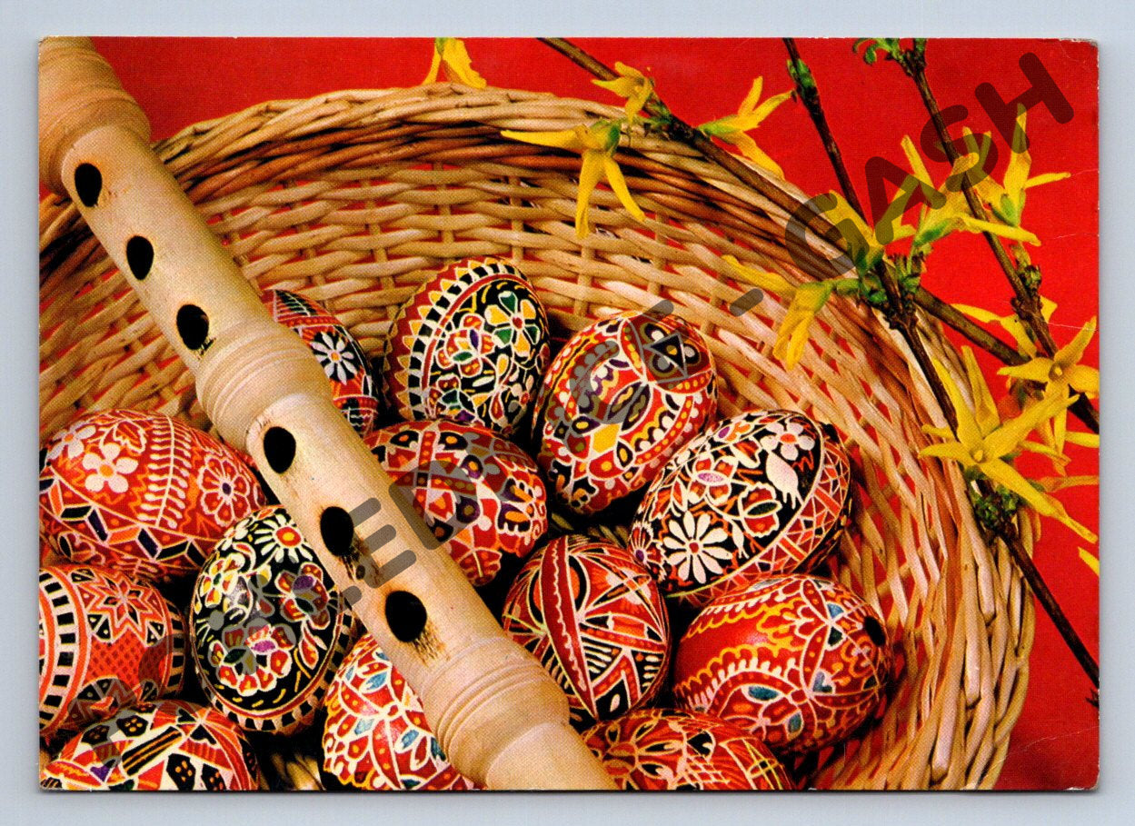 Velikonoční pohlednice zobrazující tradičně zdobená kraslice v proutěném koši, vedle nich leží dřevěná flétna a větvičky zlatic. V pozadí teplé červené barvy podtrhují sváteční atmosféru jarního období. Pohlednice je opatřena přáním Veselé Velikonoce . Fotografie Václav Hájek, tisk Severografia Děčín. Stav odpovídá stáří, viz foto. Krásná ukázka českého lidového umění a velikonočních tradic.