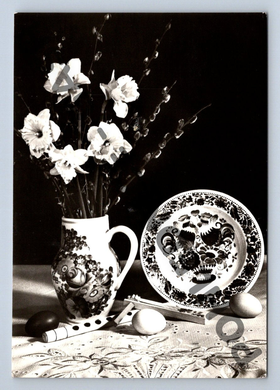 Originální černobílá velikonoční pohlednice z období první poloviny 20. století. Na lícové straně je aranžovaný zátiší s květinami (pravděpodobně narcisy), porcelánovou vázou, velikonočním nádobím a kraslicemi, což je typická velikonoční výzdoba. Zadní strana obsahuje nápis Radostné Velikonoce. Foto Josef Richtr, vydalo Nakladatelství Orbis Praha. Pohlednice je v dobrém stavu, pouze s drobným zažloutlým flíčkem na zadní straně. Skvělý sběratelský kousek pro milovníky starých svátečních pohlednic!