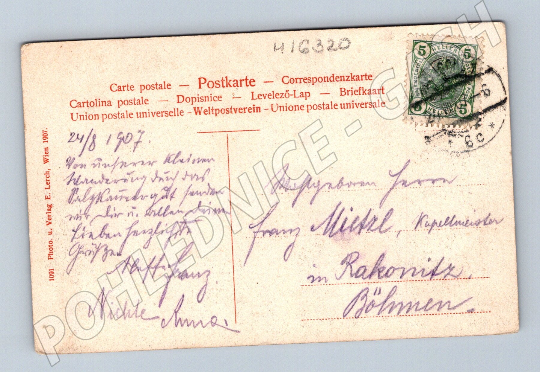 Originální historická pohlednice z roku 1907 s pohledem na město Bad Ischl v Rakousku, foceno z vyhlídky Franz Josefs-Warte. Pohlednice je ve velmi dobrém stavu odpovídajícím svému stáří, byla odeslána a je opatřena dobovou rakouskou známkou v nominální hodnotě 5 hellerů. Na zadní straně se nachází ručně psaný text a adresát v Rakovníku (Čechy). Velmi pěkný sběratelský kus pro zájemce o staré pohlednice, Rakousko-Uhersko či oblast Salzkammergut. Vydal E. Lerch, Wien.