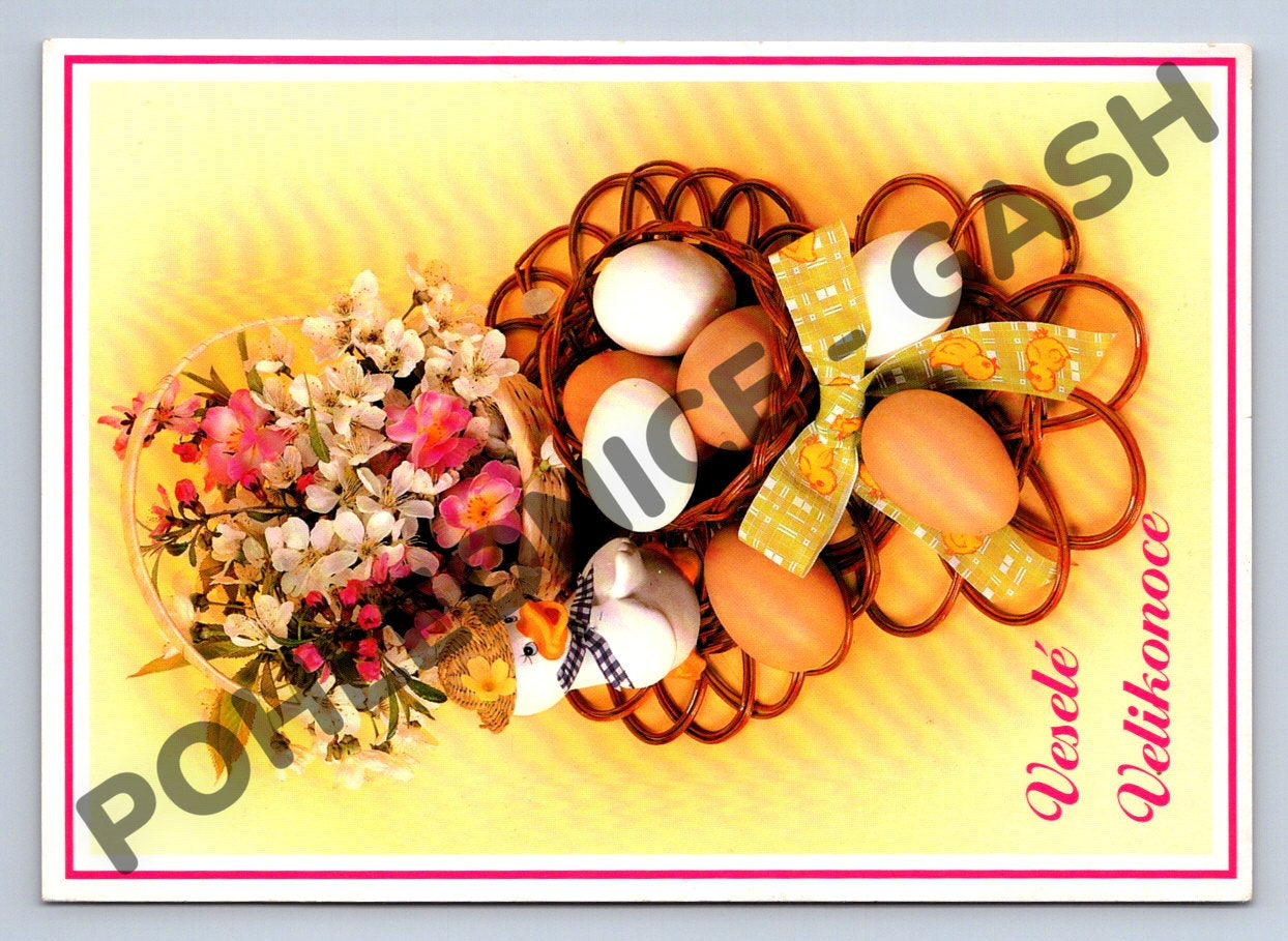 Velikonoční pohlednice z České republiky, pravděpodobně z období po roce 1950 (moderní vydání). Na lícové straně pohlednice je barevná fotografie velikonoční dekorace s tradičními kraslicemi v košíku, doplněná jarními květy a velikonočním přáním Veselé Velikonoce. Na zadní straně je ručně psaný text, adresát, poštovní známka s velikonočním motivem a razítko. Pohlednice je ve velmi dobrém stavu, vhodná jak pro sběratele, tak i jako vzpomínka na tradiční české velikonoční svátky.