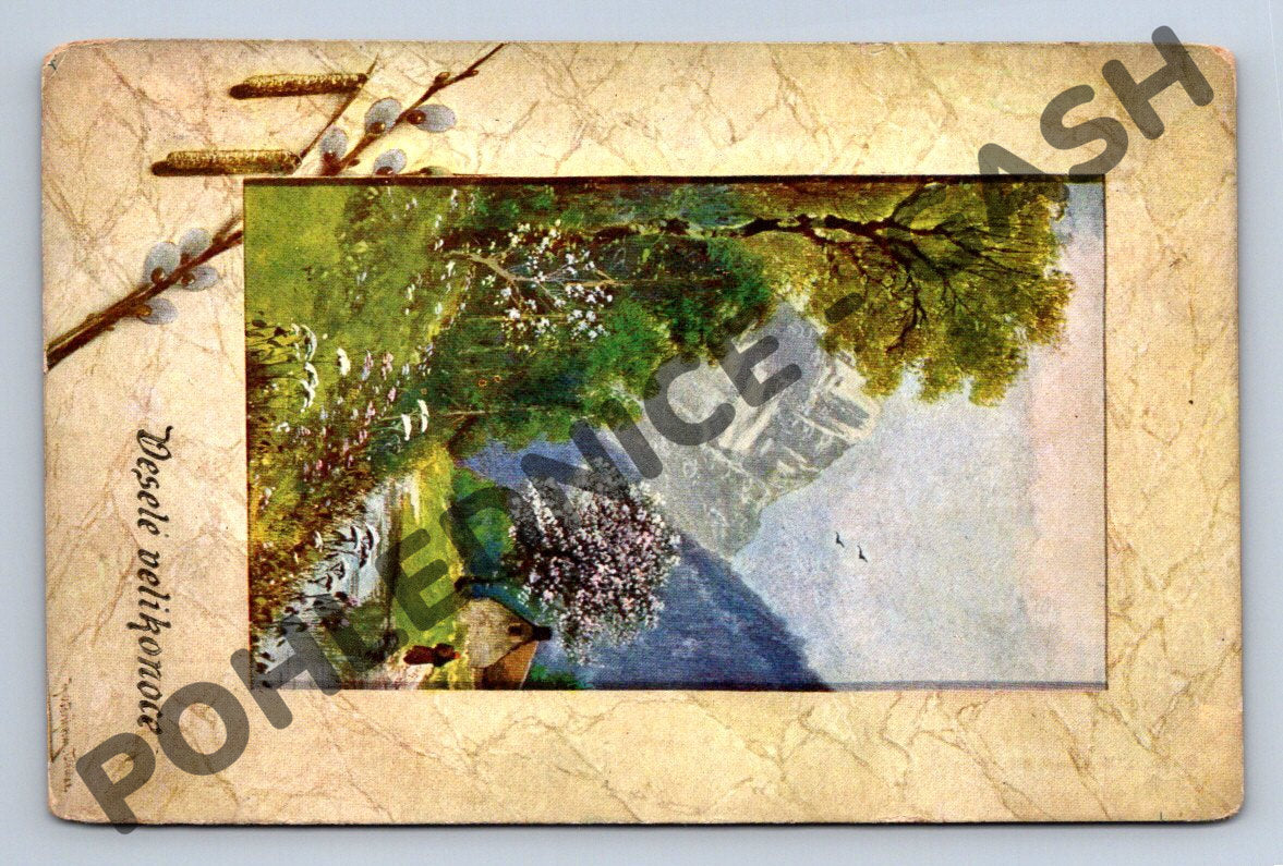 Historická velikonoční pohlednice z roku 1910 zaslaná z Rakousko-Uherska do Prahy. Motiv pohlednice zahrnuje jarní krajinu se stromy v květu a hudebním potokem, typický jemný pastelový tisk a zdobený okraj s kočičkami. Na přední straně nápis Veselé velikonoce. Na zadní straně zachované originální poštovní razítko, známka Františka Josefa I. a kompletní ručně psaný text adresovaný do Prahy. Výborný stav s drobnými známkami stáří. Velmi pěkná ukázka dobové korespondence a grafického designu z období Rakousko-Uherska.