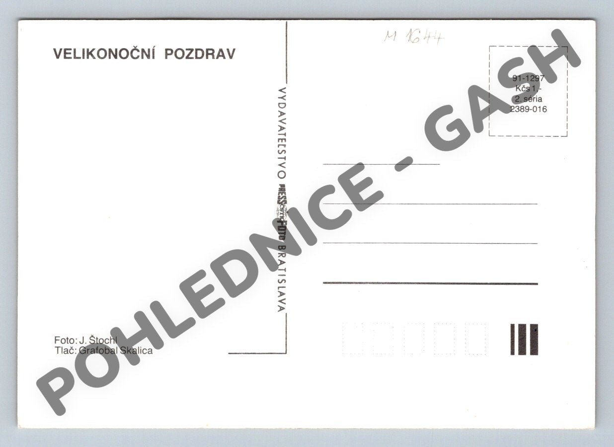 Velikonoční pohlednice s typickým velikonočním motivem – miska s malovanými vejci (modré, bílé a oranžové) a tradiční dřevěná píšťalka, položená na žlutém podkladu. Miska je zdobena květinovým vzorem s kopretinami a máky. Na zadní straně je nápis VELIKONOČNÍ POZDRAV a prostor pro adresu a známku. Vydal Pressfoto Bratislava, foto J. Štochl, tisk Grafobal Skalica. Pohlednice je zachovalá, čistá, nepopsaná, vhodná do sbírky nebo jako tematický sběratelský artefakt.