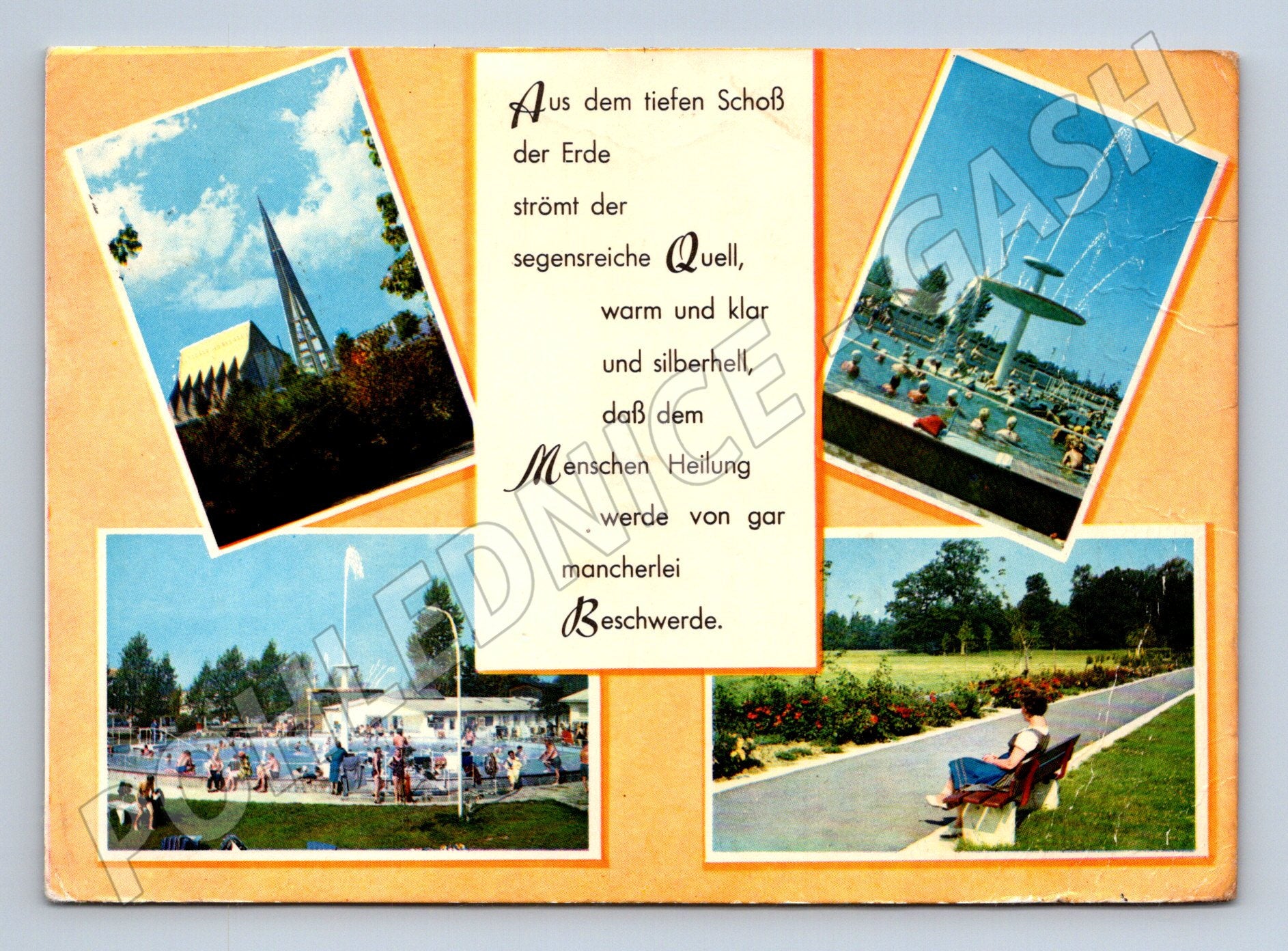 Originální barevná pohlednice z Německa, pravděpodobně ze 60. let 20. století. Na přední straně naleznete koláž fotografií s motivy městské architektury, fontány, koupaliště a parku. Uprostřed je německý poetický text o pramenu vody a jeho léčivé síle. Zadní strana je popsána a opatřena německou poštovní známkou v hodnotě 30 Pfennig, s jasně čitelným razítkem Flensburg / Schleswig . Pohlednice byla zaslána do Prahy, ČSSR. Moc pěkný sběratelský kousek s osobním vzkazem a historickou hodnotou. Stav viz foto - drobné známky opotřebení, rohy lehce ohnuté.