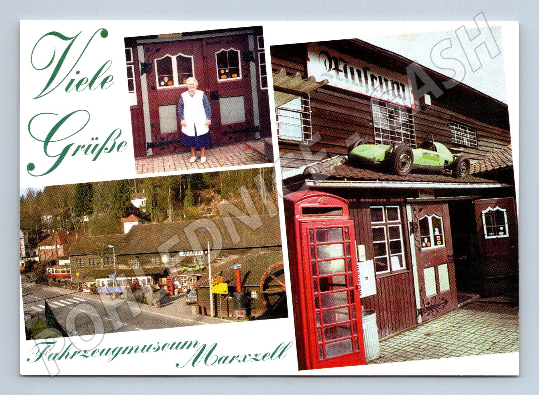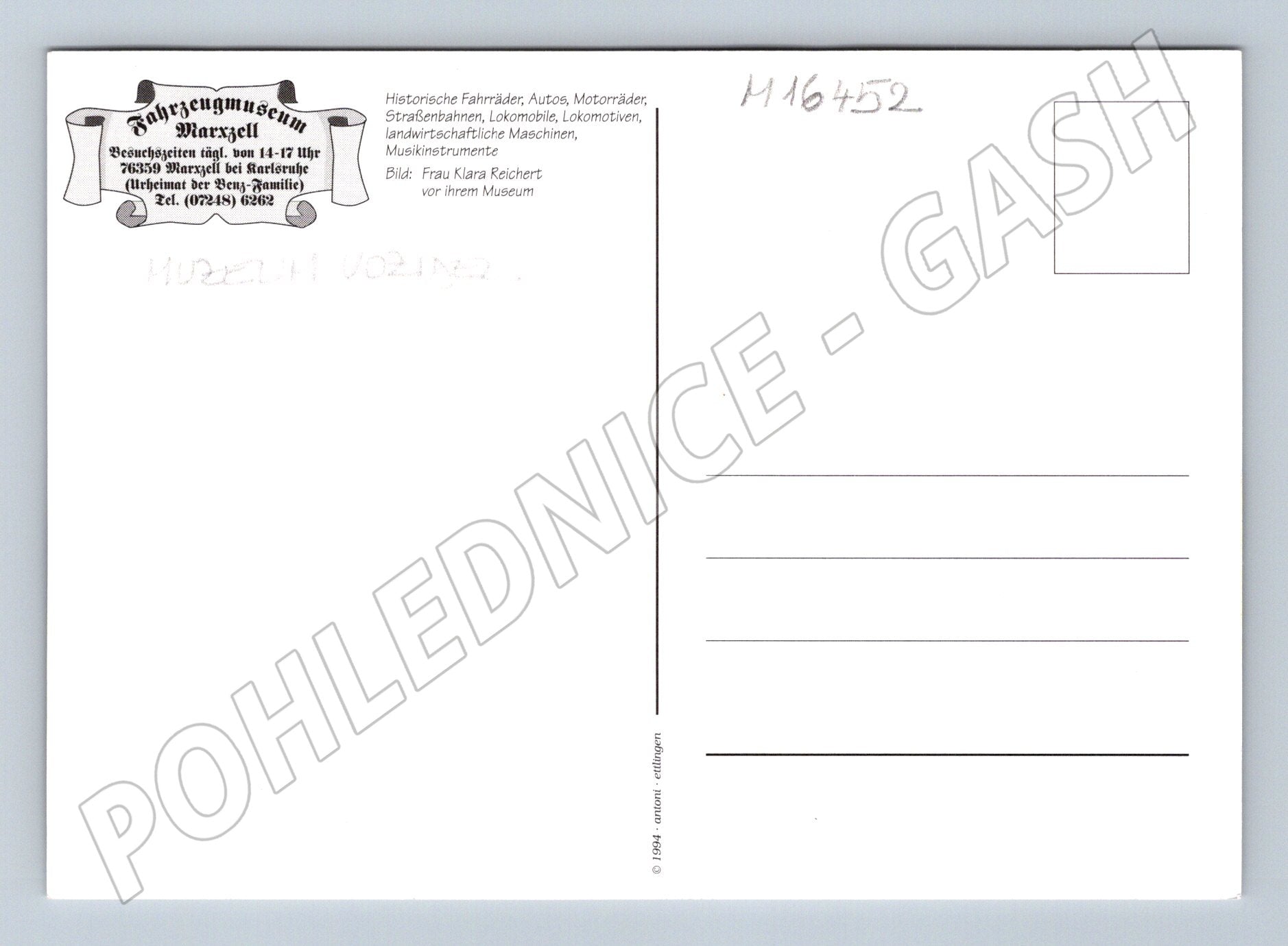 Originální pohlednice z muzea dopravních prostředků Fahrzeugmuseum Marxzell v Německu. Na přední straně jsou různé pohledy na muzeum, včetně historické budovy, britské telefonní budky, závodního vozu na střeše a fotografie pracovnice muzea. Pohlednice zachycuje atmosféru expozice věnované historickým automobilům, motocyklům, bicyklům a různým dopravním prostředkům. Vydáno kolem roku 1994, ideální pro sběratele tematických pohlednic spojených s dopravou, muzei nebo technikou. Zadní strana nepopsaná, s krátkým popisem muzea a vyznačenou adresou. Stav velmi dobrý, vhodné pro sběratelskou i výměnnou kolekci.