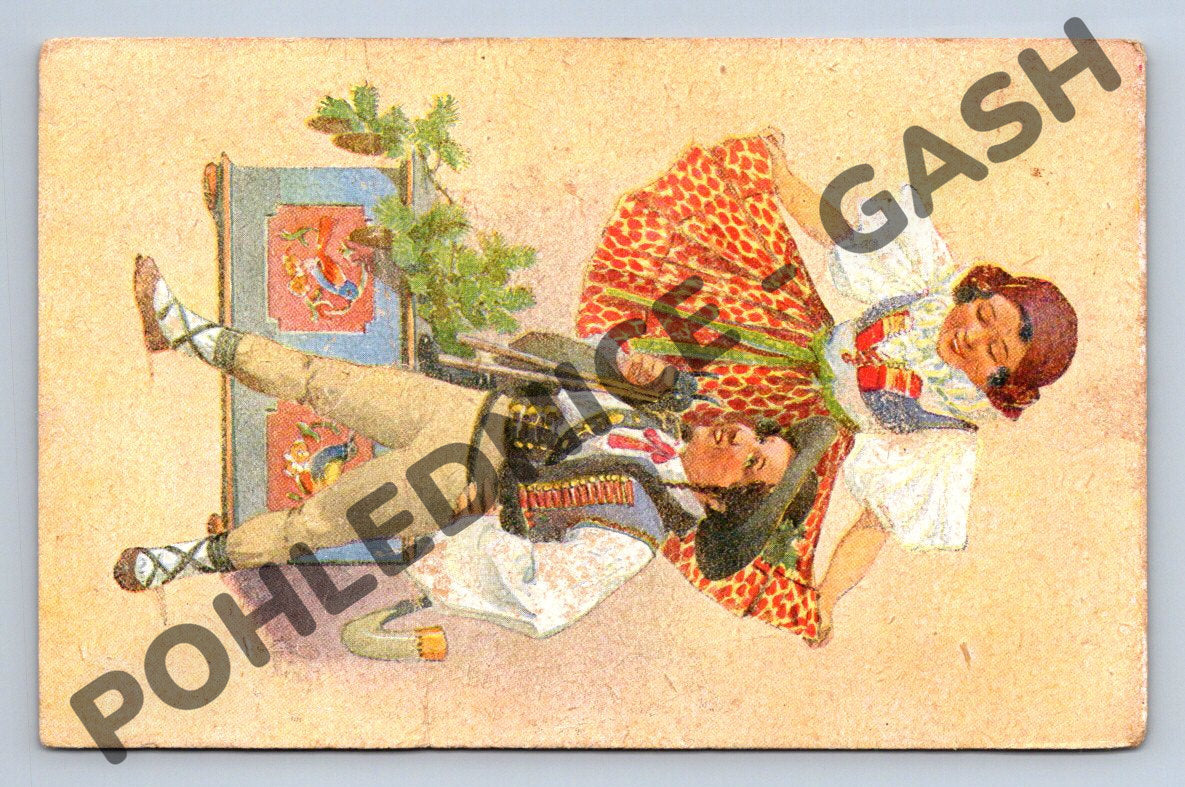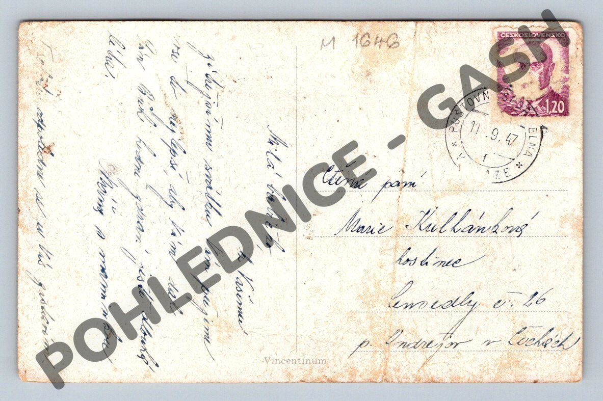Starobylá pohlednice formátu malý do roku 1950, zachycující barevnou kresbu dvou dětí s kyticí šeříků a nápisem Srdečné blahopřání . Pohlednice je psaná a byla adresována Josefu Štránskému do Nedomic. Na zadní straně je ručně psaný text včetně přání a dedikace. Pohlednice nese známky patiny, drobné ohyby, šmouhy a lehké poškození rohů, odpovídající stáří předmětu. Autentický kousek historické korespondence, ideální pro sběratele starých pohlednic nebo milovníky nostalgických suvenýrů.