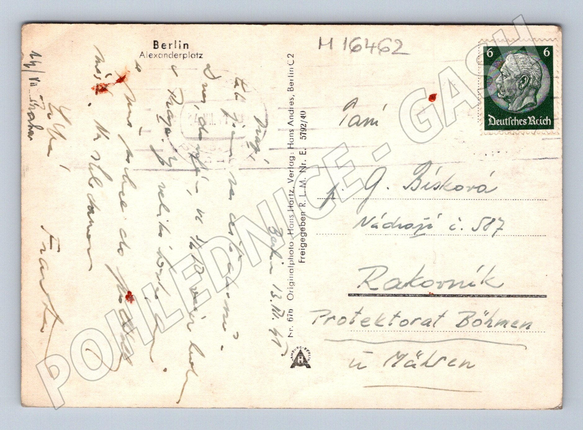 Originální historická pohlednice s motivem slavného berlínského náměstí Alexanderplatz. Na přední straně je černobílá fotografie s výhledem na Alexanderplatz a ikonickou budovu Jonass & Co, v pozadí panorama Berlína. Zadní strana je popsána, ofrankovaná německou známkou s portrétem, a s poštou odeslanou do Protektorátu Čechy a Morava (dnešní Česká republika). Pohlednice byla pravděpodobně odeslána v období druhé světové války, a představuje zajímavý autentický dobový artefakt – jak pro sběratele pohlednic, tak pro zájemce o dějiny Německa a Berlína. Stav viz foto, lehké známky stáří. Vhodné do sbírky.