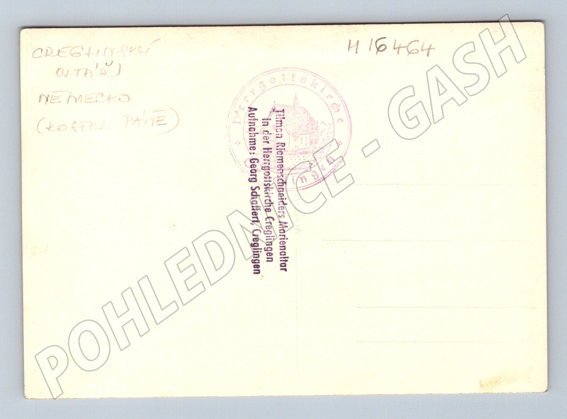 Tato černobílá pohlednice zachycuje detailní pohled na oltář v kostele v německém městě Creglingen (Herrgottskirche, oltář Panny Marie od Tilmana Riemenschneidera). Na pohlednici je vidět mistrovská řezba v gotickém stylu s bohatou figurální výzdobou a kulisou kostela v pozadí. Na zadní straně je razítko a informace o místě pořízení snímku. Pohlednice je neprošlá, velmi zachovalá, vhodná pro sběratele historických a sakrálních motivů z Německa.