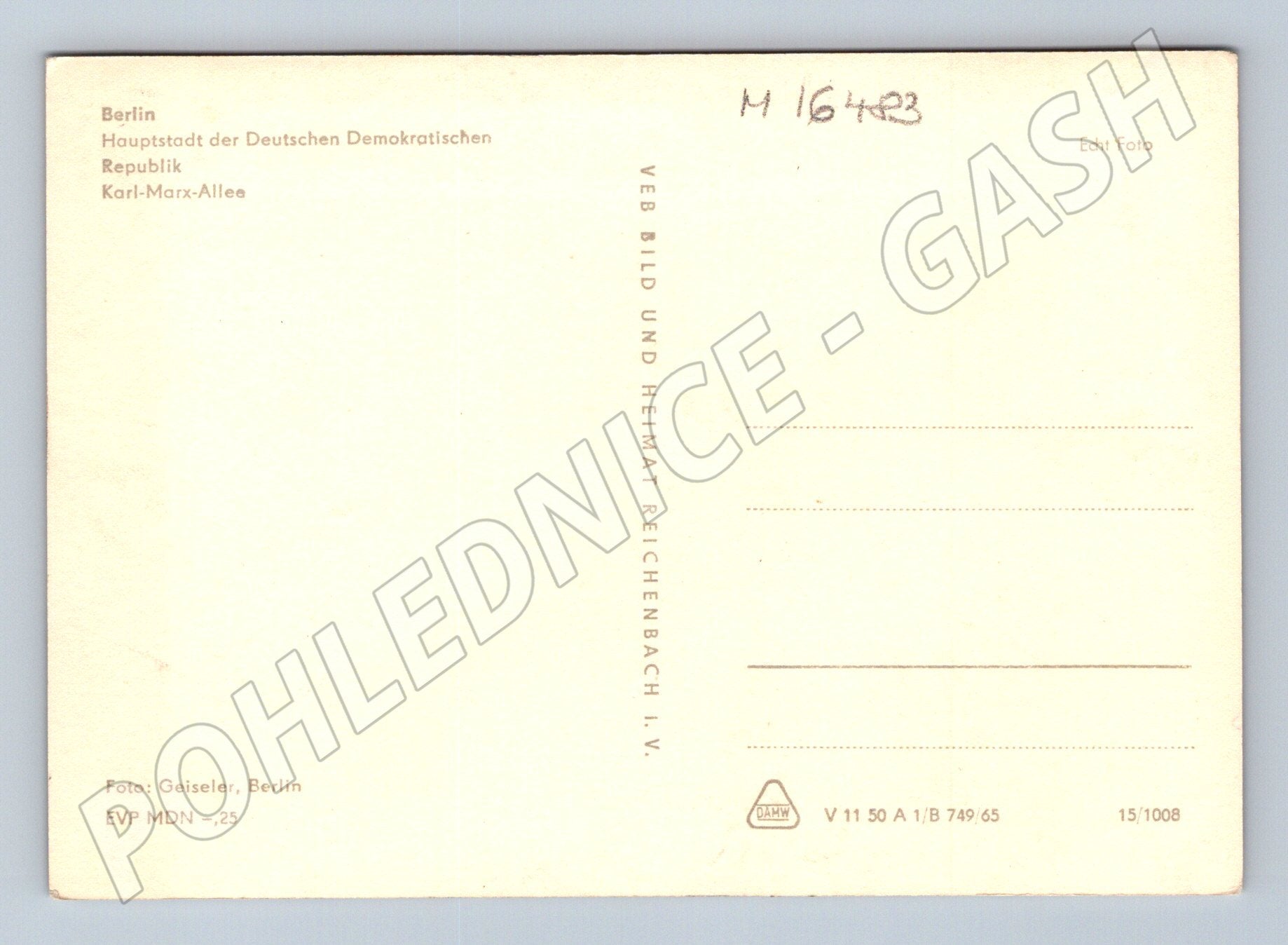 Originální černobílá pohlednice z období NDR, zobrazující slavný Hotel Berolina na Karl-Marx-Allee v Berlíně. Na pohlednici je zachycen hotel spolu s přilehlými ulicemi a dobovými automobily, což krásně dokumentuje architekturu a atmosféru tehdejší doby. Na zadní straně je uveden popis v němčině: Berlin Hauptstadt der Deutschen Demokratischen Republik, Karl-Marx-Allee . Fotografie: Geiseler, Berlin. Pohlednice je v dobrém stavu, bez popisu, pouze s archivním číslem tužkou. Ideální pro sběratele historických pohlednic, milovníky architektury nebo pamětníky Berlína.