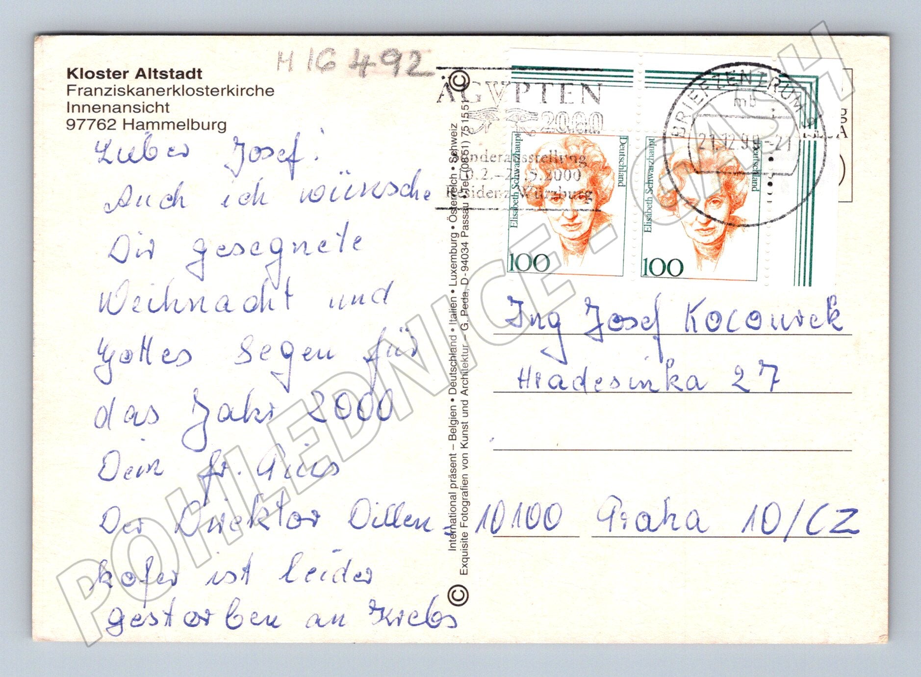 Originální pohlednice z Německa s motivem interiéru kostela (Kloster Altstadt – Františkánský klášterní kostel, Hammelburg). Na přední straně pohlednice je krásná barevná fotografie bohatě zdobeného chrámového interiéru s oltářem ve stylu baroka. Na zadní straně je pohlednice odeslána, opatřena dvěma poštovními známkami a ručně psaným textem v němčině. Pohlednice je datována rokem 2000. Velmi pěkný sběratelský kousek ve slušném stavu, vhodný do sbírky pohlednic s tématikou sakrálních staveb a zahraničních lokalit.