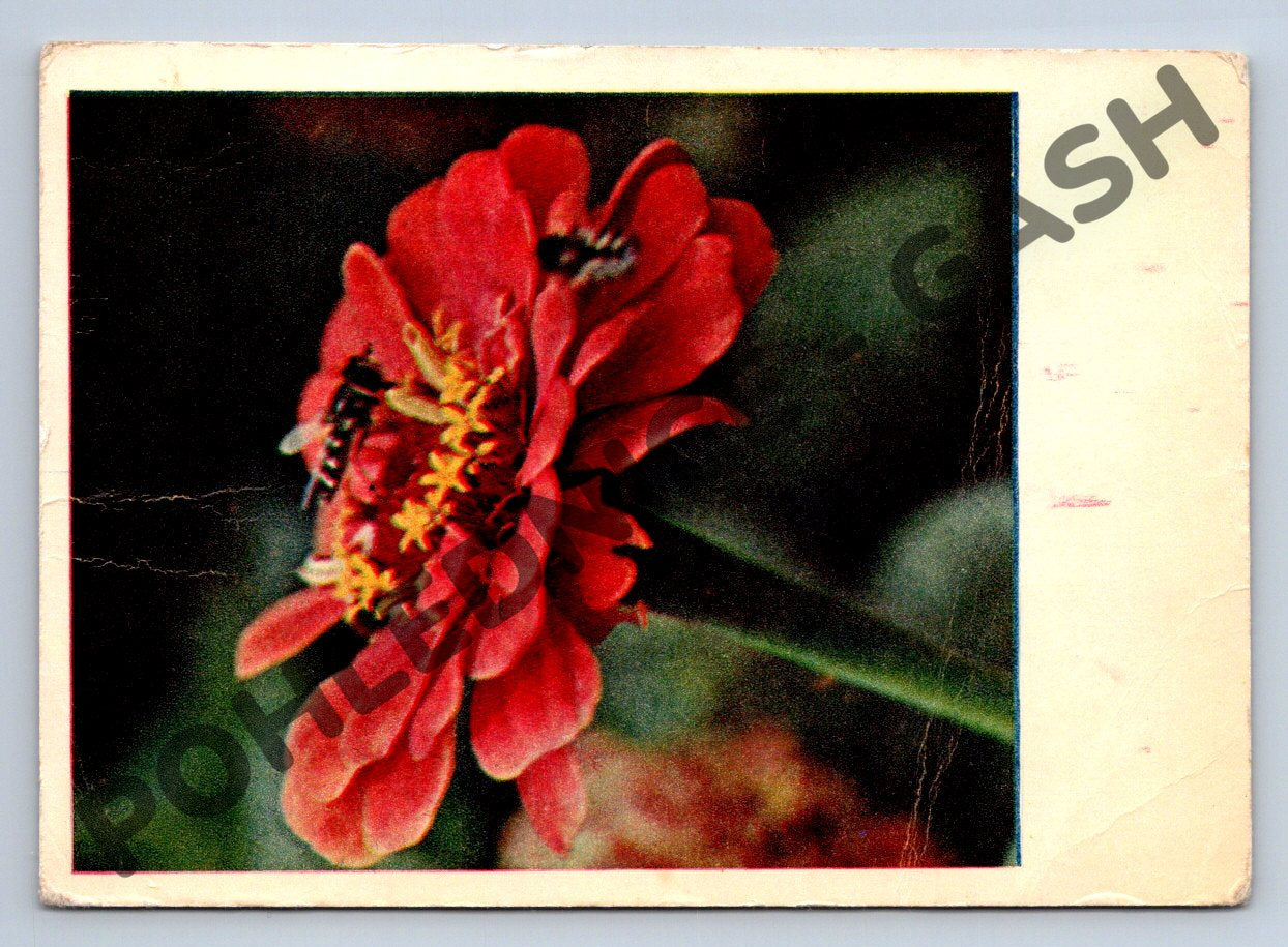 Nabízím k prodeji originální pohlednici z roku 1964, vydanou v SSSR. Na přední straně je detailní barevná fotografie červeného květu, na kterém jsou dobře patrné včely při opylování. Fotografii pořídil P. Smoljakov. Zadní strana pohlednice obsahuje místo pro adresu a vzkaz, je zde i ručně psaný vzkaz z roku 1965. Pohlednice byla vytištěna v nakladatelství novin Pravda (pojmenované po V. I. Leninovi), náklad 500 000 ks. Stav odpovídá stáří – mírné opotřebení a drobné ohyby na okrajích. Skvělý přírůstek do sbírky pohlednic s tématikou hmyzu či květin, případně zajímavý dobový artefakt z období SSSR.