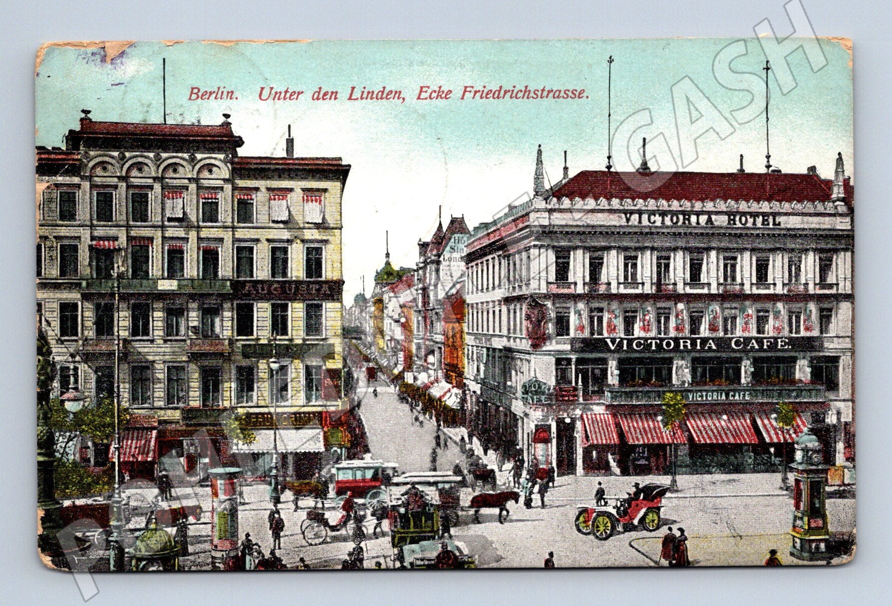 Originální historická pohlednice zobrazující slavnou berlínskou ulici Unter den Linden na rohu s Friedrichstrasse. Na přední straně najdete krásně kolorovaný pohled na rušnou ulici s hotelem Victoria a kavárnou Victoria Café, koňskými povozy a prvními automobily, což skvěle vystihuje atmosféru počátku 20. století v Berlíně. Pohlednice byla odeslána a je opatřena německou známkou i dobovým razítkem z Berlína s datací 27.3.1913. Zadní strana obsahuje rukopisný vzkaz. Skvělý sběratelský kousek pro milovníky historie, architektury a starých pohlednic z Německa.