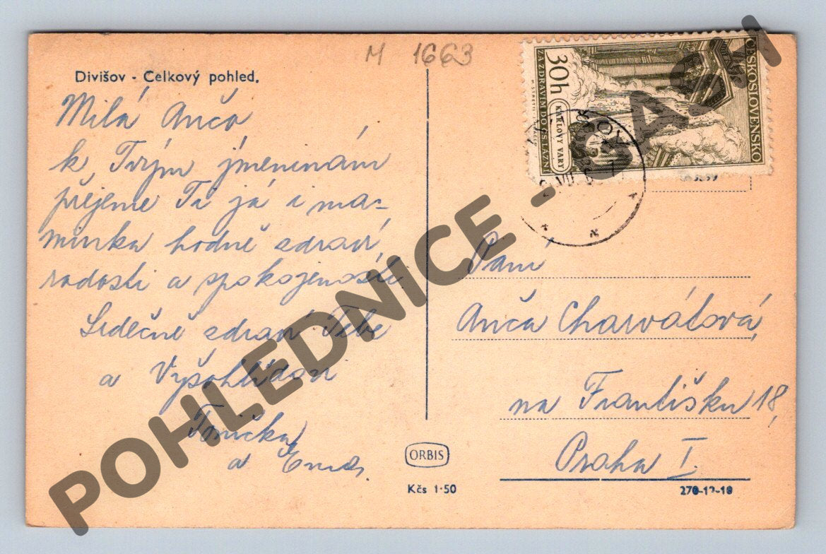 Originální stará pohlednice Divišov - Celkový pohled. Pohlednice je v malém formátu, byla odeslána s poštovní známkou Československo 30h. Na zadní straně je ručně psaný text s adresou do Prahy a známkami času. Pohlednice zachycuje panoramatický pohled na město Divišov s dominantou kostela v pozadí, orámovaný přírodou v popředí. Stáří a patina dodávají sběratelskou hodnotu, vhodná pro milovníky historie a regionální tématiky.