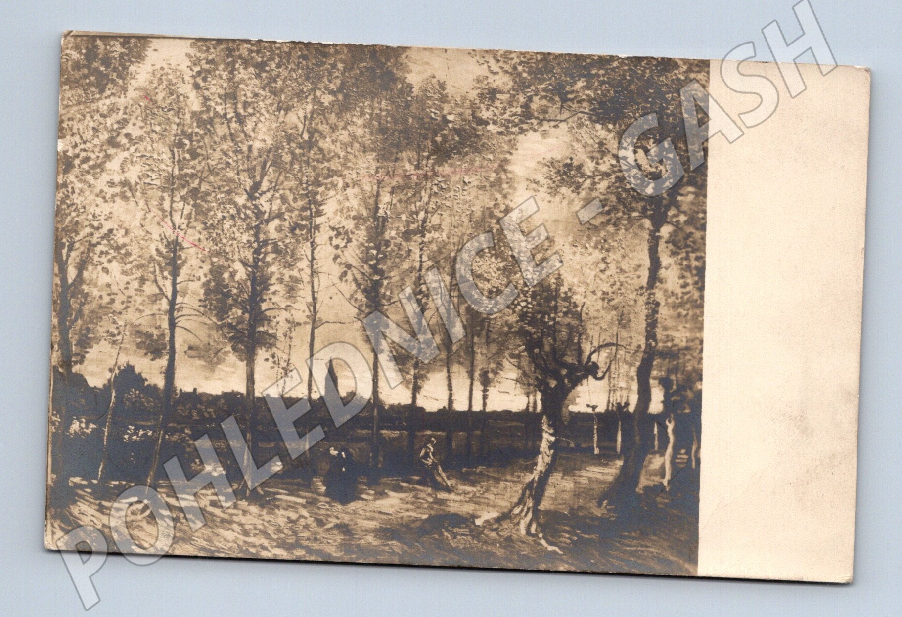 Starší pohlednice s názvem Vine. View Sophs Rotterdam . Pohlednice je ve velmi dobrém stavu vzhledem ke svému stáří, mírné opotřebení rohů. Na přední straně je zobrazen malebný pohled na krajinu s řadou vysokých stromů, pod nimiž jsou vidět postavy lidí. V pozadí lze rozeznat siluetu kostela či dominantní stavby. Zadní strana je nepopsaná, pouze s ručním popisem tužkou (datováno 20. 6. 1913). Zajímavý kousek pro sběratele historických pohlednic s evropskou tématikou.