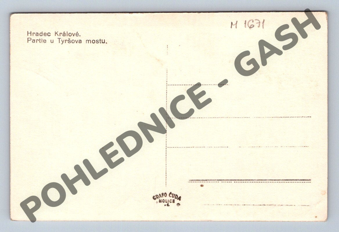Originální historická pohlednice Hradec Králové – Partie u Tyršova mostu. Pohlednice zachycuje krásné panorama města s výraznými architektonickými dominantami, v popředí je dobře viditelný park a Tyršův most. Na zadní straně označení vydavatele (Grafo Cuda, Holice) a místo pro známku a adresu. Pohlednice je ve velmi dobrém stavu bez výrazného poškození, vhodná pro sběratele i milovníky regionální historie. Malý formát, vydání pravděpodobně před rokem 1950.