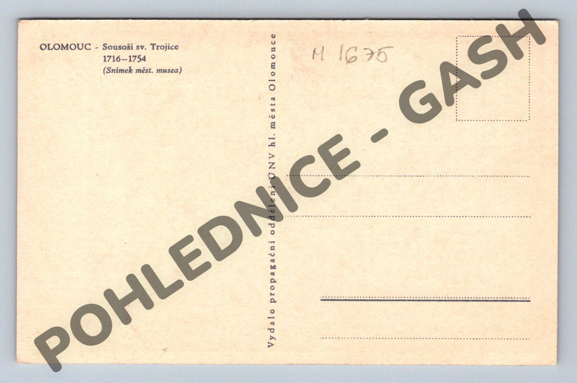 Originální černobílá pohlednice zobrazující Sloup Nejsvětější Trojice na Horním náměstí v Olomouci, významnou barokní památku a památku UNESCO. Na přední straně pohlednice je detailní záběr na sousoší, na zadní straně je text: OLOMOUC - Sousoší sv. Trojice 1716–1754 (Snímek měst. musea) . Pohlednice nebyla použita, je v dobrém sběratelském stavu, bez výrazných poškození. Jedná se o pohlednici vydanou propagačním oddělením ÚNV města Olomouce, vhodnou pro sběratele historických pohlednic či zájemce o památky města Olomouce.