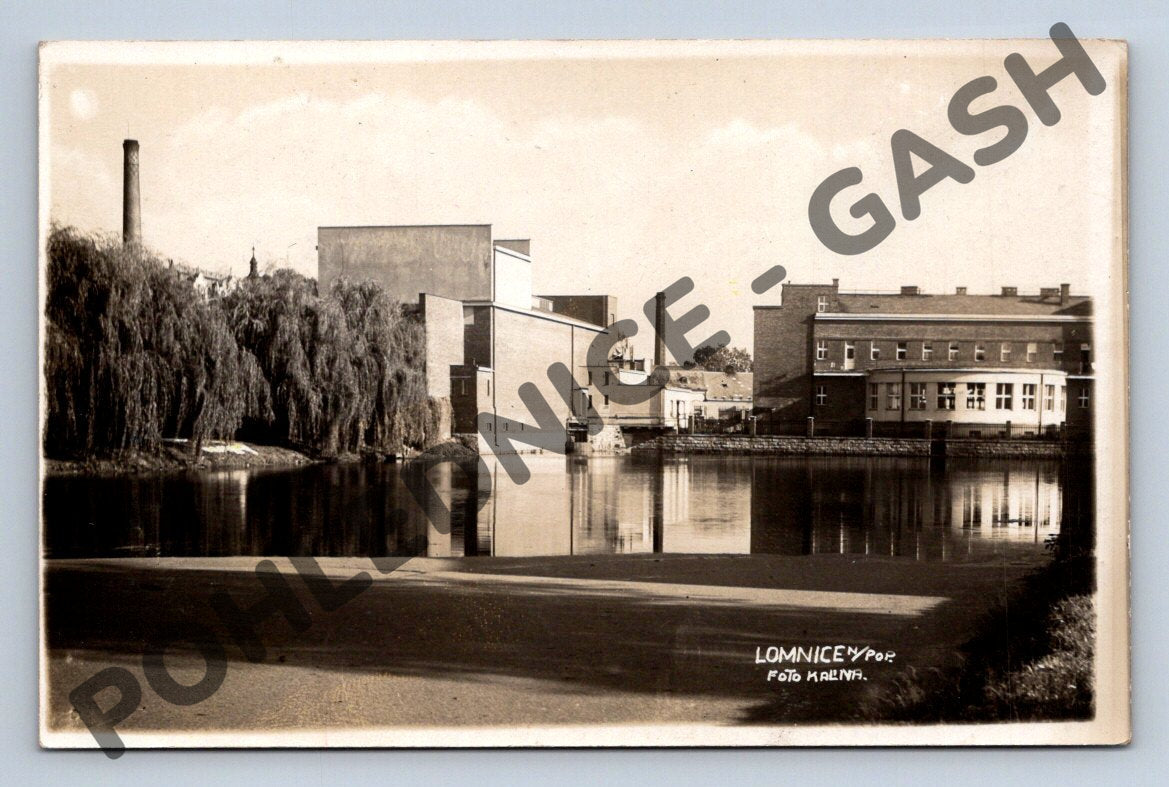 Originální historická pohlednice zachycující továrnu v Lomnici nad Popelkou. Fotografii pořídil známý regionální fotograf Kalina. Pohlednice je ve velmi dobrém stavu, s ručně psaným textem a poštovním razítkem z první poloviny 20. století. Na přední straně je černobílý snímek průmyslového areálu a vodní plochy, která odráží tovární budovy a okolní zeleň. Zadní strana obsahuje adresu a dobovou korespondenci. Zajímavý sběratelský kousek s regionálním motivem a atmosférou doby.