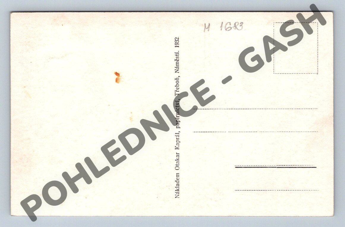 Starší černobílá pohlednice zobrazující slavný rybník Svět v Třeboni. Jedná se o pohlednici vydanou papírnictvím Otakar Kaprál, Třeboň, přibližně z období první poloviny 20. století. Pohlednice zachycuje malebnou krajinu s vodní hladinou a stromy na břehu, s nápisem Třeboň – rybník Svět dole v rohu. Na zadní straně standardní dělení pro adresu a zprávu, mírné stopy stáří, včetně nepatrných skvrn. Sbírkový kus vhodný pro milovníky jihočeských památek a historie Třeboně.