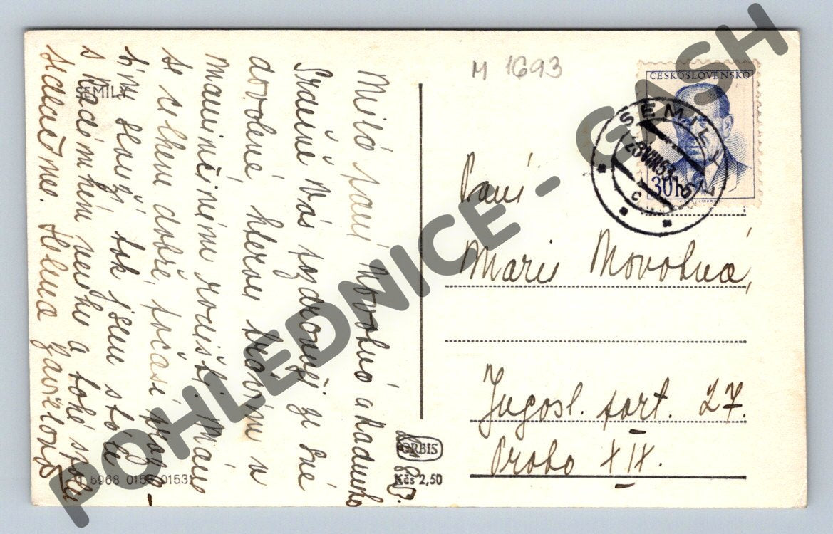 Nabízím originální černobílou pohlednici zobrazující panoramatický pohled na české město s mostem přes řeku v popředí, domy, kostelem a zvlněnou krajinou v pozadí. Pohlednice byla odeslána (s poštovní známkou a razítkem), adresována na Marii Novákovou, Jugoslávská, Brno. Na zadní straně je psaný text v českém jazyce. Jedná se o historický kousek, vhodný pro sběratele nebo zájemce o historii českých měst. Stav viz foto, dobře zachovalé rohy, mírné stopy stáří a manipulace. Rozměr klasického malého formátu, vydáno před rokem 1950.
