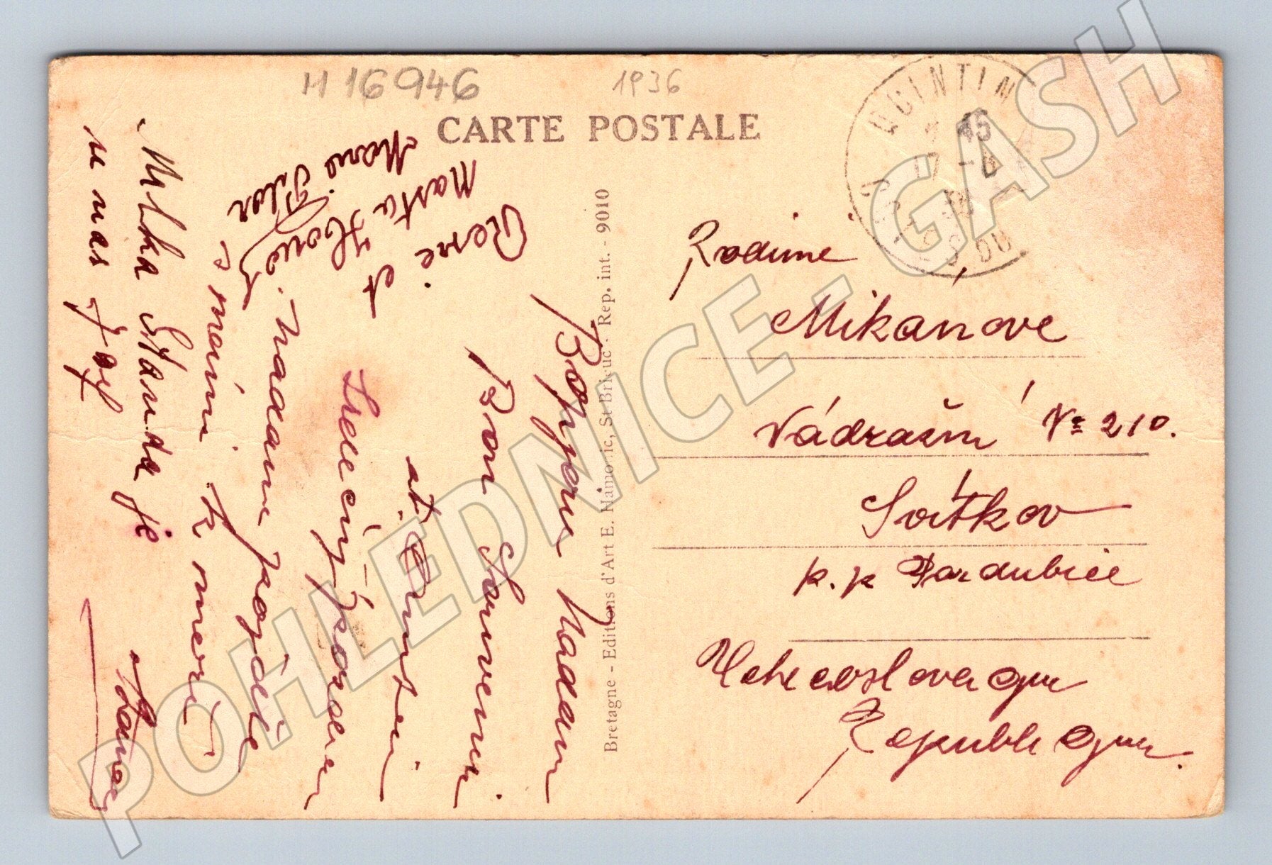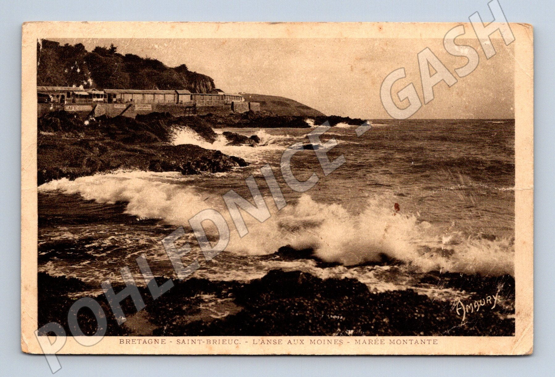 Originální stará pohlednice z Bretaně, Francie, konkrétně z oblasti Saint-Brieuc – L’Anse aux Moines při přílivu (marée montante). Na přední straně je krásná monochromatická fotografie pobřeží s vlnami narážejícími na skaliska a budovami podél pobřeží. Pohlednice byla odeslána a je opatřena známkami používání (psaný text, razítko), nesoucí autentickou atmosféru začátku 20. století. Skvělý sběratelský kousek dokumentující francouzskou krajinu i historii poštovních služeb. Stav dle foto, mírné opotřebení odpovídající stáří.