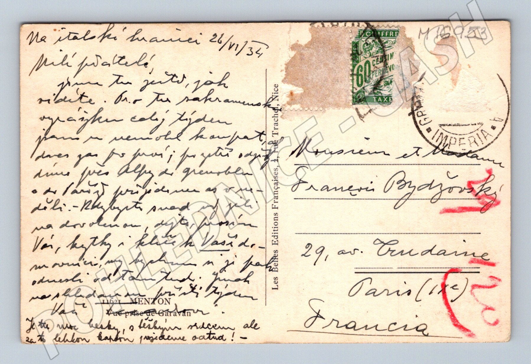 Originální stará pohlednice s černobílou fotografií města Menton na francouzské Riviéře (Côte d’Azur). Pohled z vyvýšeného místa nabízí krásný výhled na pobřeží s ikonickou promenádou a městskou architekturou. Na přední straně je označení „ADIA“ a číslo 1167 – MENTON. Zadní strana obsahuje původní rukopisný text ve francouzštině a částečně v češtině, dále známku a razítko Imperia, červené popisky a adresu do Paříže. Pohlednice je datována 26/VI/34 (1934). Celkově zachovalý stav odpovídající stáří, drobné známky opotřebení v rozích a kolem známky. Výborný sběratelský kousek z meziválečné Evropy, vhodné pro milovníky starých pohlednic, historie nebo francouzské Riviéry.