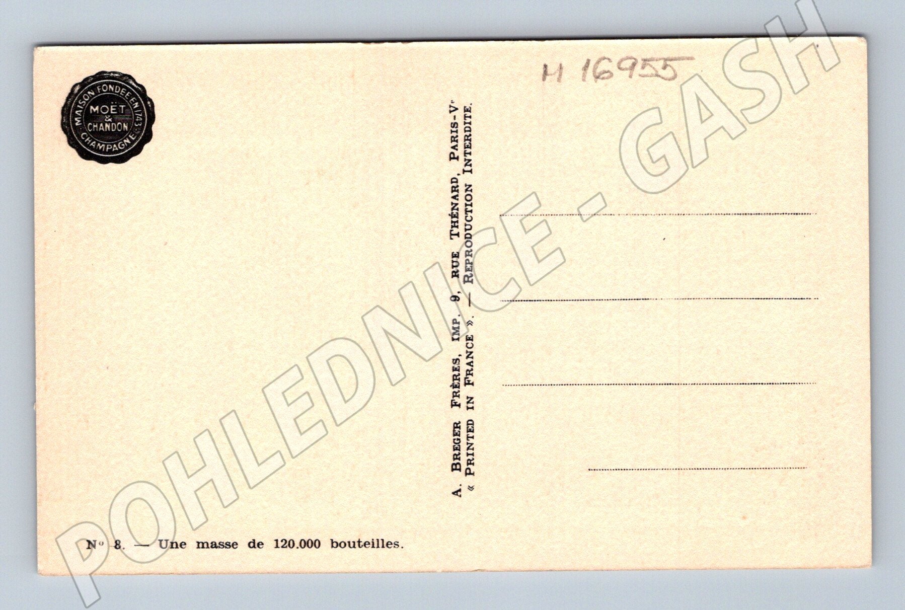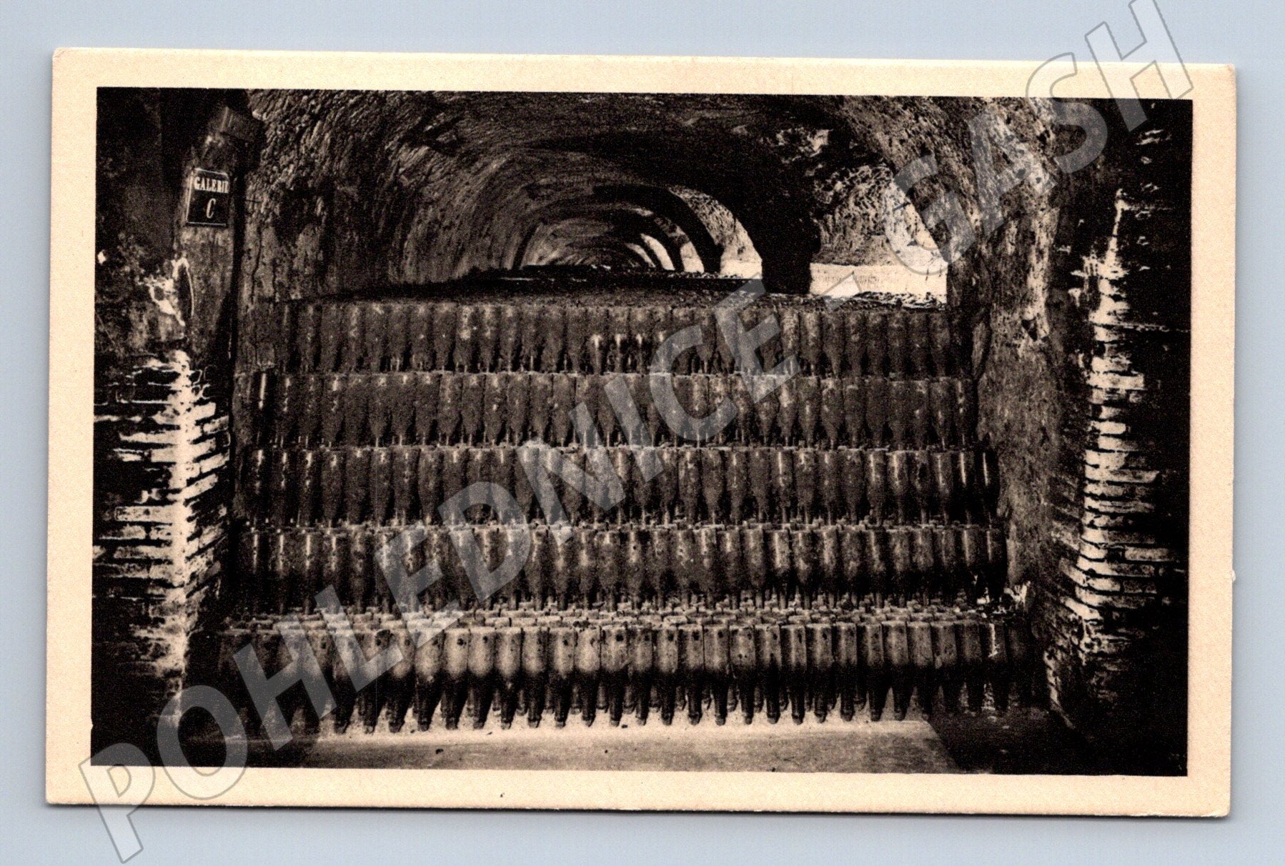 Originální černobílá pohlednice z Francie s motivem sklepa prestižního šampaňského domu Moët & Chandon v Épernay. Na přední straně zachycuje rozsáhlé sklepní prostory s tisíci lahvemi šampaňského, přesněji podle popisu až 120 000 lahví uložených ke zrání. Pohlednice není prošlá poštou, má čistou zadní stranu s logem Moët & Chandon a francouzským popisem. Jedná se o zajímavý historický doklad výroby šampaňského a elegantní sběratelský kousek pro milovníky vinařství, francouzské historie i pohlednic s industriální tématikou. Stav velmi dobrý, bez viditelných poškození, vhodné i jako dárek nebo do sbírky.