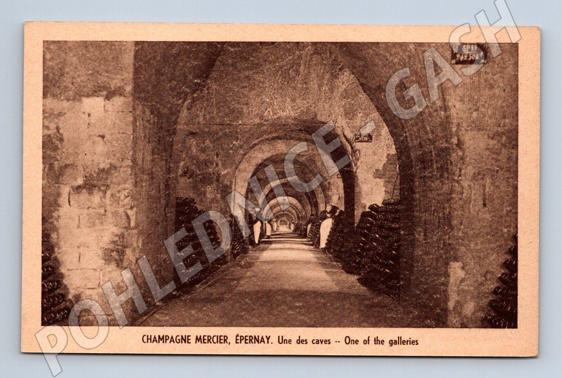 Originální pohlednice z období kolem roku 1937 propagující slavné sklepy Champagne Mercier v Épernay, Francie. Na přední straně je vyobrazena jedna z galerií podzemních sklepů, kde jsou skladovány láhve šampaňského. Text v angličtině i francouzštině naznačuje propagaci pro mezinárodní publikum během světové výstavy v Paříži (Exposition Internationale, Paris 1937). Rubová strana obsahuje propagační text a adresní linie, pohlednice nebyla dosud použitá. Výborný stav, krásný sběratelský kus vhodný pro milovníky vinařských motivů či historie reklamy.
