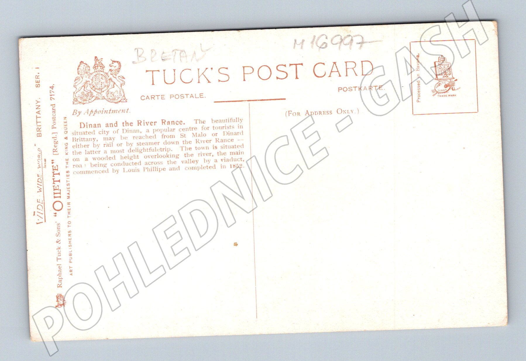 Starobylá pohlednice s vyobrazením města Dinan a řeky Rance v Bretani, Francie. Pohlednici dominuje malebný pohled na historický viadukt, řeku a tradiční domy podél břehu v nádherném krajinářském provedení. Na zadní straně pohlednice je popis v angličtině, který zmiňuje významné architektonické a přírodní pamětihodnosti této oblasti, viadukt a jeho dokončení v roce 1852. Výrobce Tuck & Sons, série Oilette . Pohlednice je neprošlá poštou, velmi pěkný zachovalý stav – vhodná pro sběratele i milovníky francouzských památek.