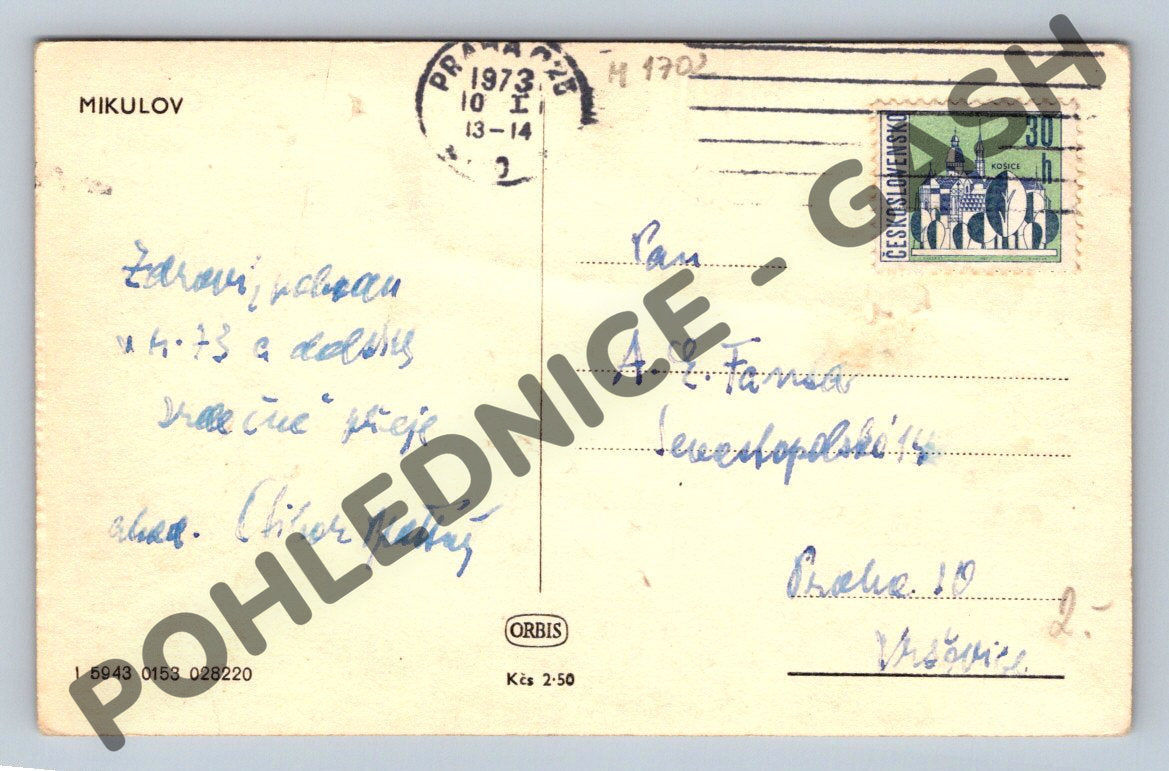 Originální černobílá pohlednice města Mikulov s motivem historického náměstí a morového sloupu Nejsvětější Trojice. Na přední straně je zachycena radnice s hodinovou věží a okolní měšťanské domy, typické pro architekturu jižní Moravy. Pohlednice byla odeslána v roce 1973, obsahuje poštovní razítko a známku ČSSR v hodnotě 30 haléřů. Na zadní straně naleznete krátký ručně psaný vzkaz. Pohlednice je v zachovalém stavu, vhodná pro sběratele či milovníky historických pohlednic a jihomoravských měst.