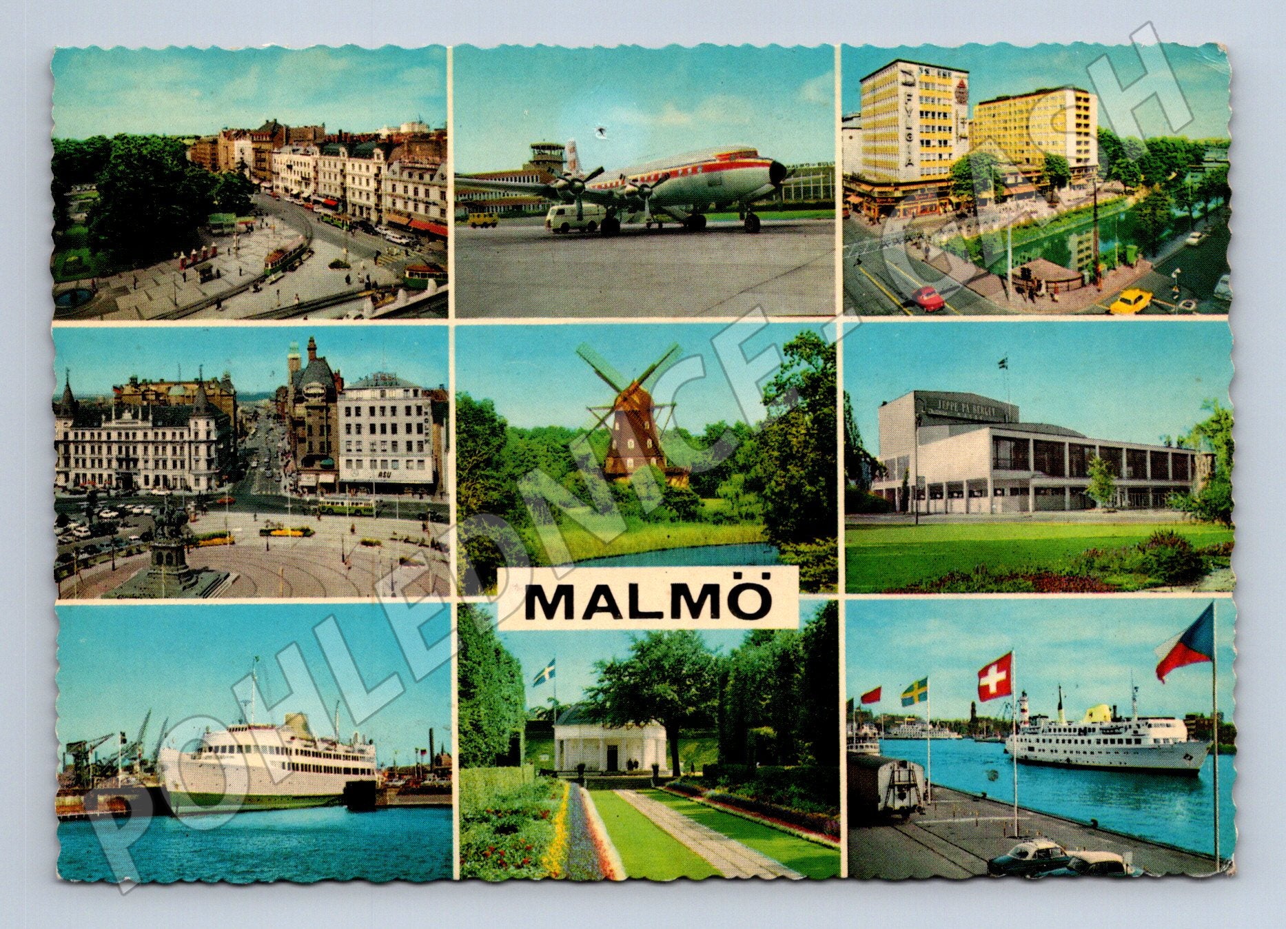 Originální pohlednice z města Malmö ve Švédsku. Pohlednice je kolážová, zobrazuje několik významných míst a pamětihodností tohoto města, včetně přístavu, historických budov, větrného mlýna či letiště. Na zadní straně je ručně psaný text se švédskou známkou v hodnotě 45 öre. Pohlednice byla odeslána do Československa, nese jasné známky stáří a autentického použití. Ideální sběratelský kousek pro milovníky skandinávských měst a historických pohlednic.