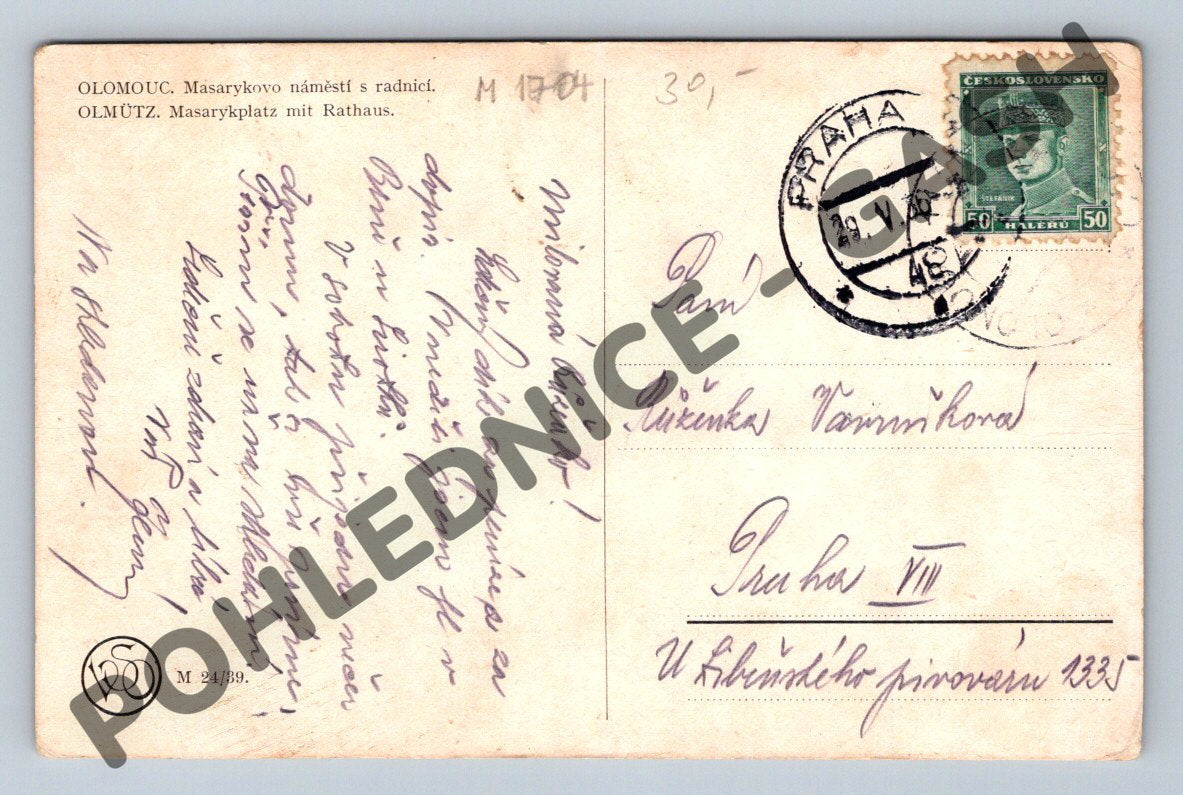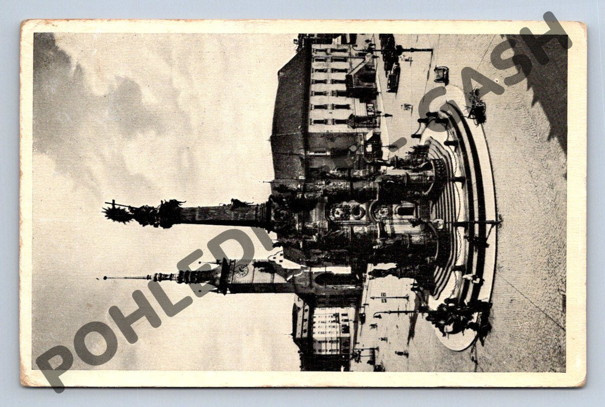 Historická pohlednice zachycující olomoucké Horní náměstí s radnicí a barokním Sloupem Nejsvětější Trojice. Na zadní straně se nachází ručně psaný text, známka z období Československa (50 haléřů, portrét prezidenta) a poštovní razítko PRAHA 1947. Pohlednice je dobového malého formátu a nese autentické známky stáří a používání, ideální do sbírky historických pohlednic z Moravy a unikátních památek UNESCO. Slavný sloup je zapsán na Seznam světového dědictví UNESCO a je jednou z nejvýznamnějších barokních památek ve střední Evropě.