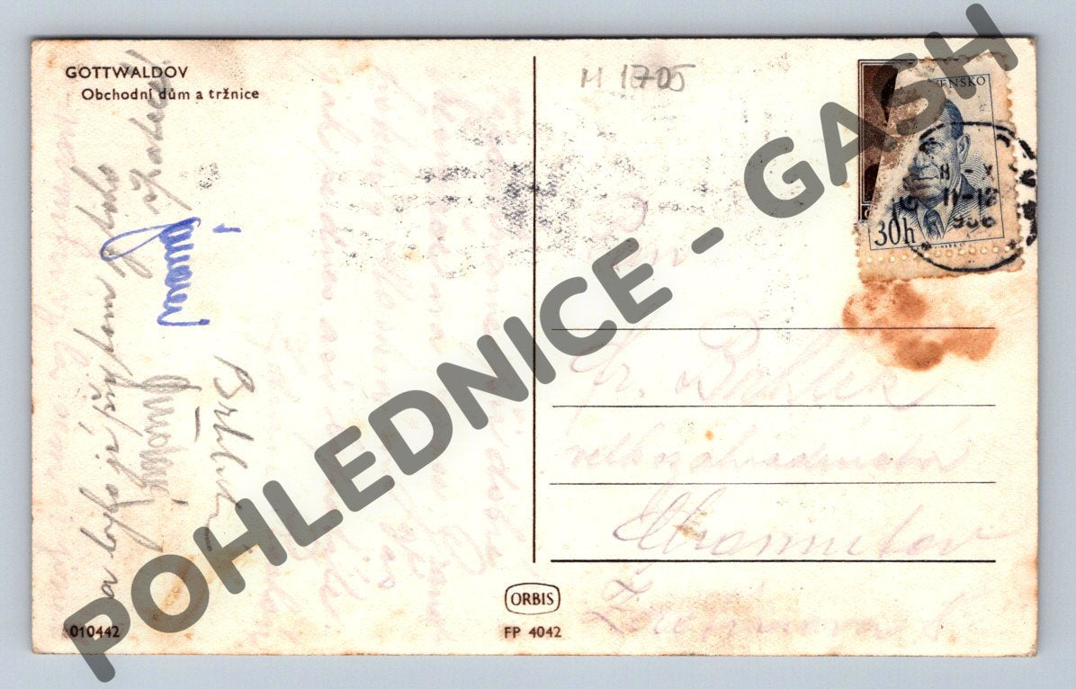 Starší pohlednice se záběrem na obchodní dům a tržnici v Gottwaldově (dnešní Zlín). Na přední straně je černobílá fotografie modernistické budovy obchodního domu obklopené lidmi a městskou zástavbou. Zadní strana obsahuje ručně psaný vzkaz, adresu a známku Československo, která podtrhuje historickou hodnotu pohlednice. Vhodné pro sběratele zaměřující se na architekturu, městskou krajinu první poloviny 20. století nebo sběratelství z oblasti Zlína (tehdejšího Gottwaldova). Pohlednice nese dobové stopy používání a známky stáří.