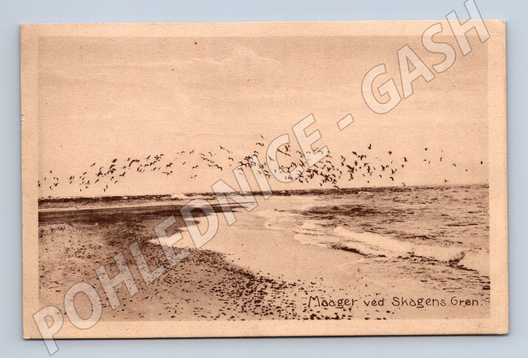 Starší pohlednice s černobílou fotografií pobřeží u Skagens Gren v Dánsku, na které je zachycen roj racků letících nad mořem. Na přední straně je nápis Måger ved Skagens Gren , na zadní straně je popis v češtině: Skagens Gren, písečná kosa, kde se setkávají vody Baltského a Severního moře. Pohlednice má standardní rozměr, známky stáří i drobné opotřebení. Zajímavý sběratelský kus pro milovníky přírody, ptactva a severské krajiny.