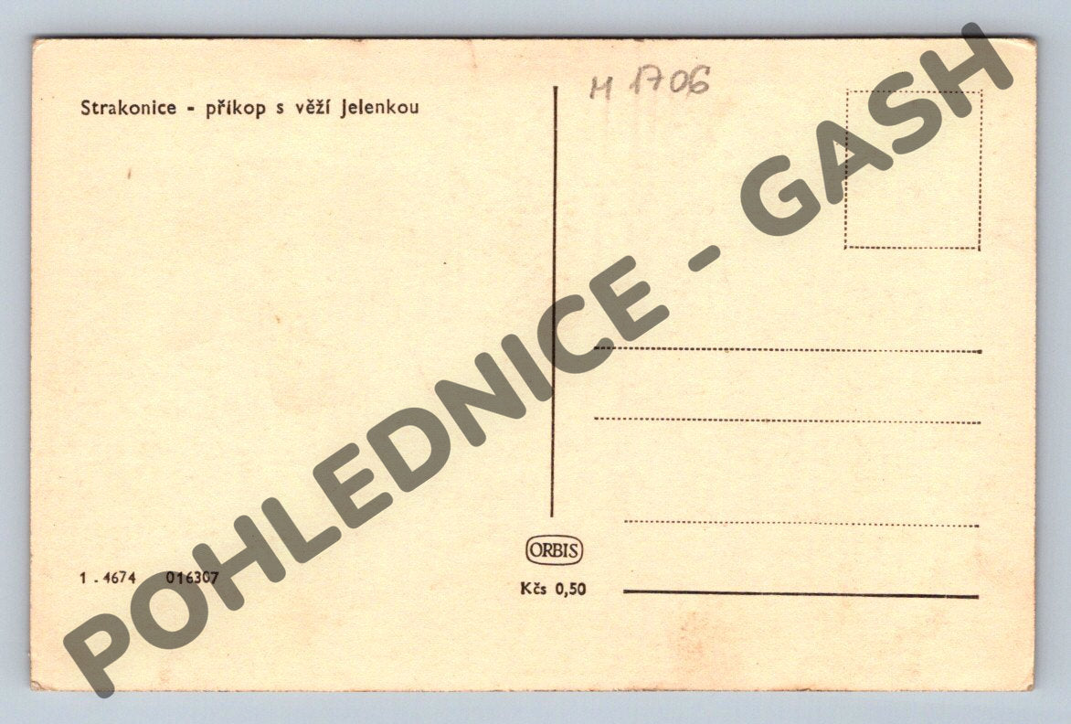 Originální černobílá pohlednice zachycující pohled na Strakonický hrad – příkop s věží Jelenkou. Na přední straně vidíme monumentální část hradu s výraznými stavebními prvky, včetně věže, části hradeb a střešních vikýřů. Pohlednice je neprošlá, v dobrém sběratelském stavu – na zadní straně pouze běžné známky stáří a drobné značení tužkou. Vydavatel ORBIS, cena 0,50 Kčs. Skvělý přírůstek do sbírky historických pohlednic s motivem českých hradů.