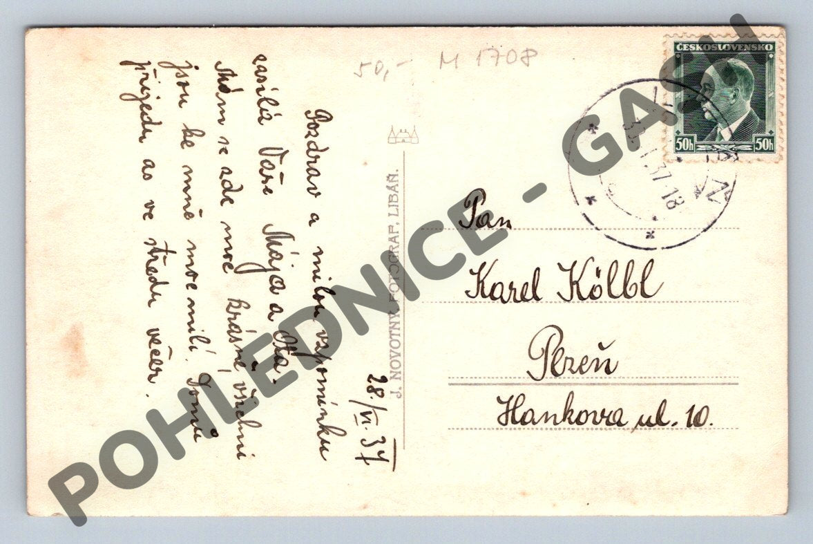 Originální historická pohlednice města Libáň z období před rokem 1950. Na pohlednici je krásný černobílý snímek panoramatu města s výraznou dominantou kostela v centru. Na zadní straně je ručně psaný pozdrav, pohlednice byla odeslána a je opatřena dobovou známkou ČSR s razítkem Rjilice. Vydal fotograf J. Novotný, Libáň. Celkově velmi pěkný sběratelský stav, bez vážnějšího poškození. Vhodné pro sběratele historických pohlednic a regionálních motivů.