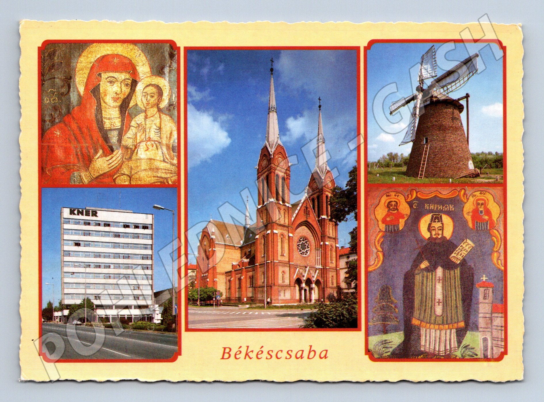 Pohlednice z maďarského města Békéscsaba. Na přední straně je koláž několika motivů: pravoslavné náboženské ikony, větrného mlýna, moderní i historické architektury a dominantního kostela s dvěma věžemi. Pohlednice je neprošlá, ve velmi dobrém stavu, se zoubkovanými okraji. Na rubu nechybí typická rozvržení prostoru pro adresu, známku a text. Tištěno v Budapešti, fotografie od Bakonyi T., Csobaji E. a Tulok F. Skvělý sběratelský kousek s motivy z regionu Békéscsaba.
