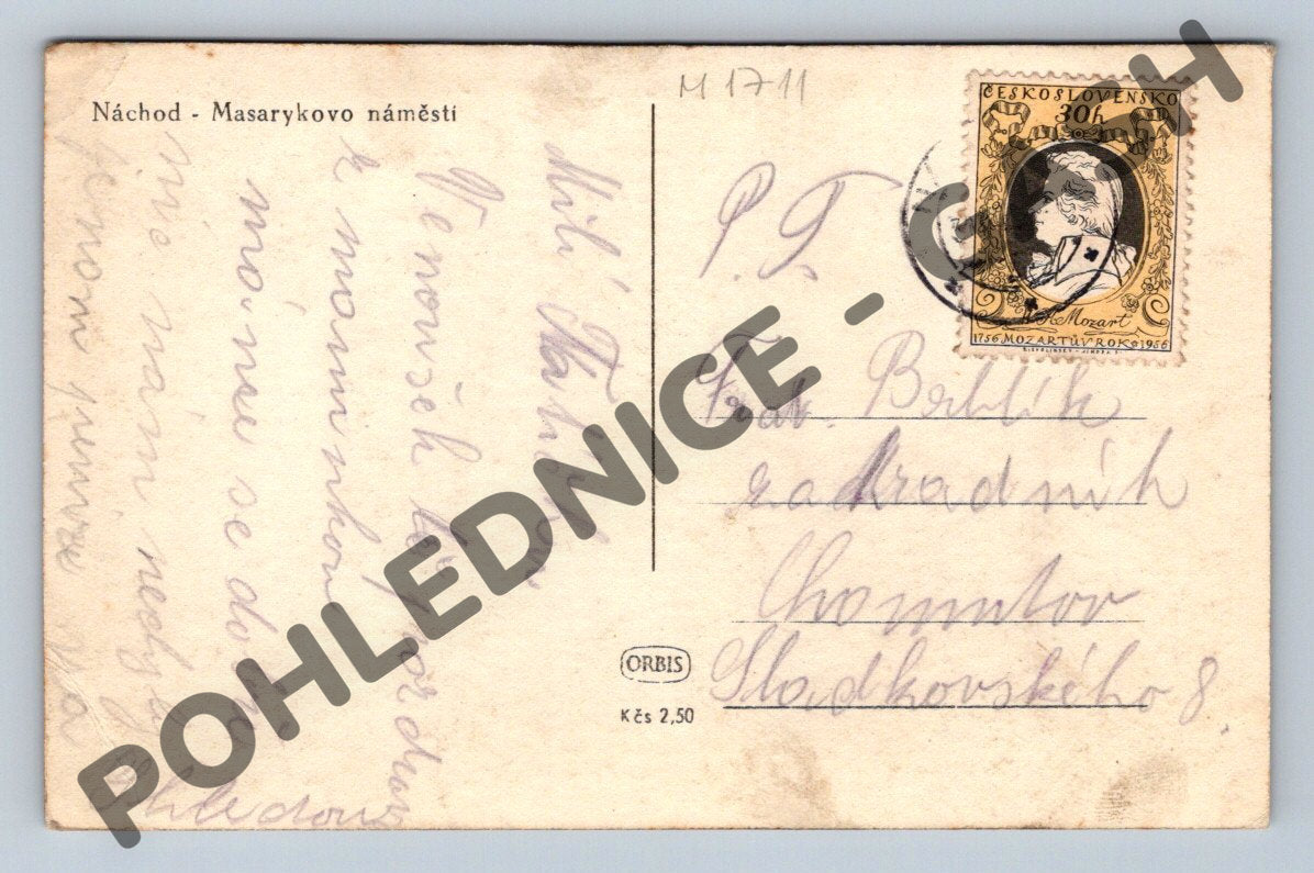 Originální stará pohlednice zobrazující Masarykovo náměstí v Náchodě. Na přední straně je krásný pohled na historické centrum s radnicí a okolní zástavbou. Pohlednice byla odeslána, opatřena známkou s motivem Mozarta a poštovním razítkem. Zadní strana obsahuje ručně psaný vzkaz adresovaný Františku Baťkovi do Chomutova. Celkově je pohlednice ve sběratelském stavu s mírným opotřebením odpovídajícím stáří. Skvělý přírůstek do sbírky starých pohlednic měst České republiky do roku 1950.