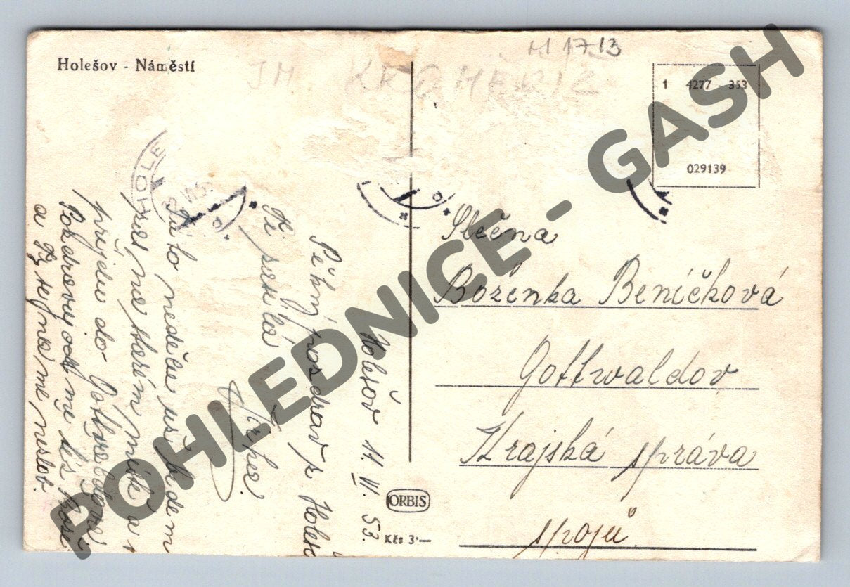 Originální černobílá pohlednice zachycující náměstí v Holešově s pohledem na historické budovy a kostel. Na přední straně je krásný pohled na náměstí, kde je vidět každodenní ruch malého města a architektonické detaily doby. Na zadní straně je ručně psaný text a známky používání. Jedná se o autentickou pohlednici vydanou před rokem 1950, malý formát. Pohlednice je vhodná pro sběratele historických pohlednic s tematikou českých měst a architektury. Stav odpovídá stáří, mírně zaoblené rohy a známky oběhu.
