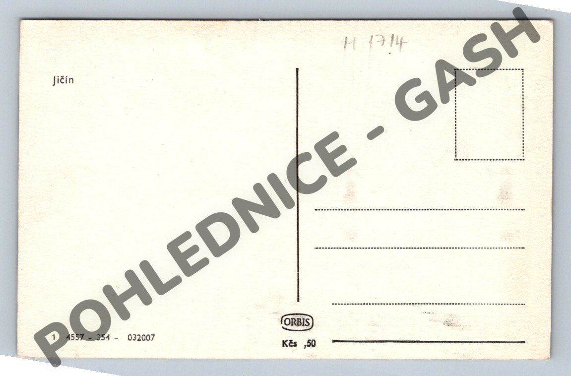 Originální historická pohlednice s motivem města Jičína, konkrétně jeho hlavního náměstí. Snímek zachycuje Městské náměstí s typickou podloubkovou architekturou a okolní krajinou ve vyobrazení z první poloviny 20. století. Na zadní straně pohlednice je natištěný popis Jičín a standardní rozložení pro psaní adresy i vylepení známky. Vydavatel ORBIS, cena 0,50 Kčs. Pohlednice je ve velmi dobrém sběratelském stavu bez popsání. Ideální doplněk do sbírky regionálních pohlednic, vhodné též jako dárek nebo pro milovníky historie českých měst.