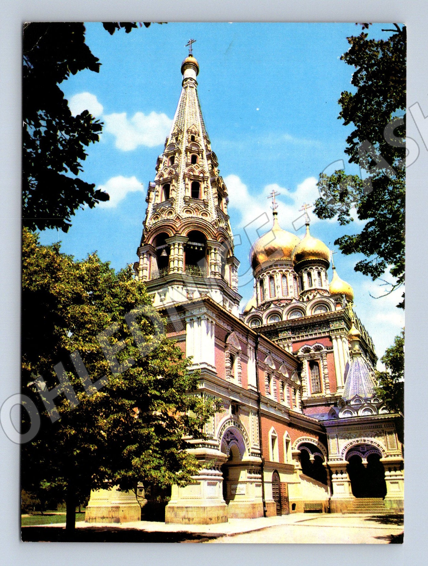 Tato pohlednice zachycuje slavný chrám-pamětník Šipka (Shipka) v Bulharsku. Na přední straně je krásná barevná fotografie monumentální pravoslavné památky s typickými zlatými kupolemi a bohatě zdobenou fasádou, zasazenou do zeleni a pod modrou oblohou. Na zadní straně najdete stručný popis stavby ve více jazycích (bulharsky, francouzsky, německy) a místo pro známku i adresu. Pohlednice je neprošlá a nese drobné známky stáří. Ideální přírůstek do sbírky pohlednic s mezinárodními památkami.