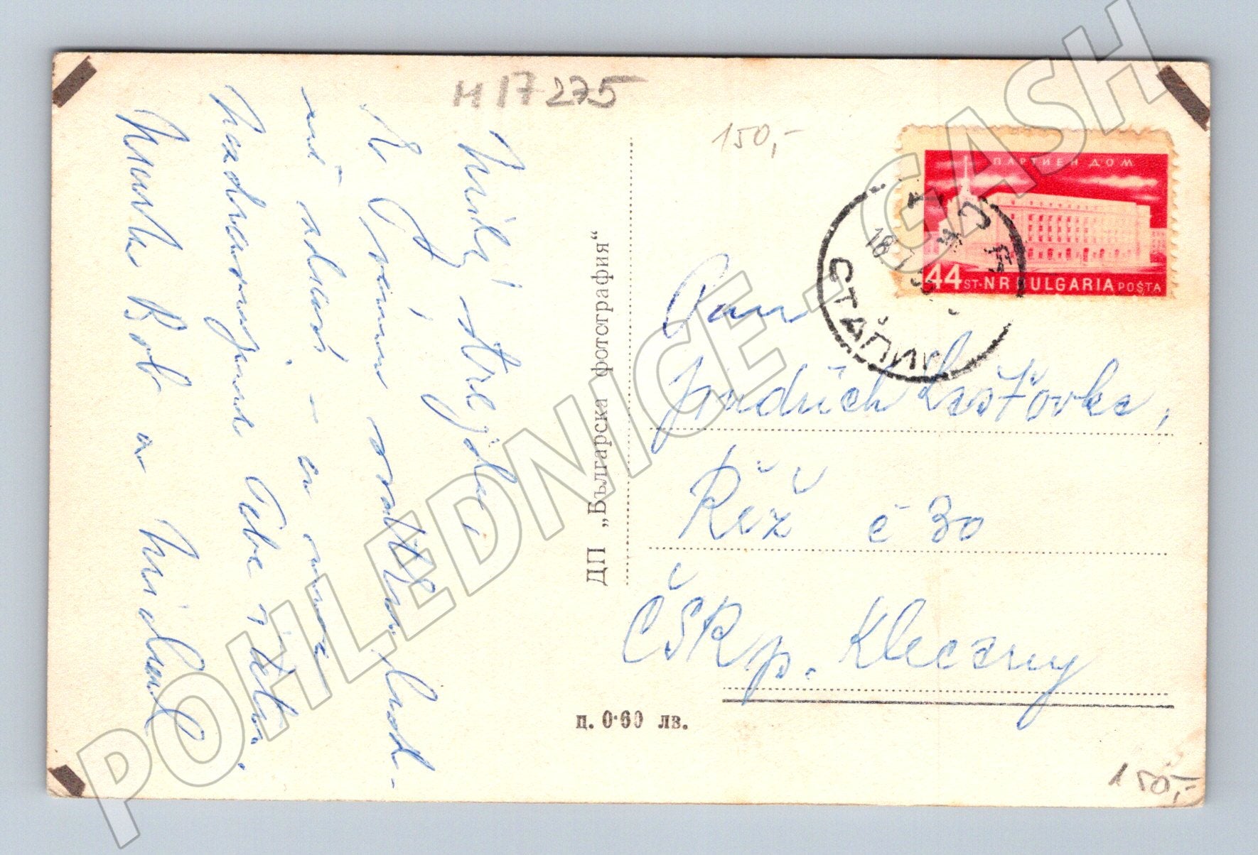 Originální historická pohlednice z Bulharska, zobrazuje vstup do mořské zahrady ve městě známém jako Stalin (dnes Varna). Pohlednice je černobílá s popisem ve třech jazycích: bulharsky, francouzsky a rusky. Na přední straně je monumentální vstup s kolonádou a sochou. Zadní strana je vyplněna rukopisným textem, opatřena poštovní známkou a poštovním razítkem z Bulharska. Pohlednice je z období, kdy město Varna neslo jméno Stalin (1950-1956), což z ní činí vzácný sběratelský kousek. Stav viz foto. Výjimečné svědectví dobové historie a architektury.
