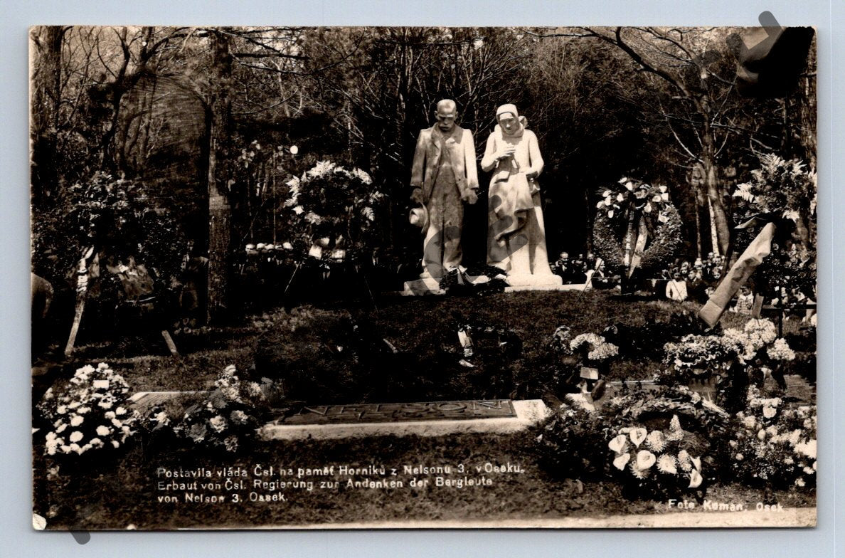 Originální stará pohlednice zobrazující památník postavený československou vládou na paměť horníků z dolu Nelson 3 v Oseku. Památník i okolí jsou bohatě ozdobeny květinovými věnci a kyticemi. Nápis na pohlednici je v češtině i němčině: Postavila vláda Čsl. na paměť Horníků z Nelsonu 3. v Oseku. Erbaut von Čsl. Regierung zu Andenken des Bergleute von Nelson 3. Osek. Fotografii pořídil Komar z Oseku. Zadní strana pohlednice je nepopsaná, pohlednice je ve velmi dobrém stavu, s patrnými stopami stáří. Atraktivní sběratelský kousek pro milovníky historie a hornické tématiky.