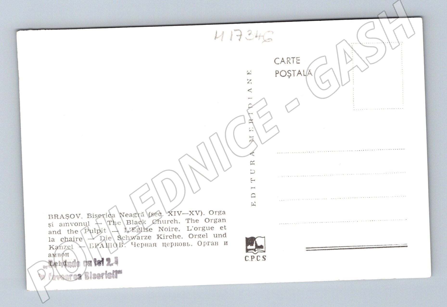 Originální černobílá pohlednice zobrazující interiér slavného kostela Biserica Neagră (Černý kostel) v Brašově, Rumunsko. Na snímku dominují nádherné varhany a kazatelna v gotickém stylu, řadící tento objekt mezi nejvýznamnější památky střední Evropy. Pohlednice pochází z vydavatelství Editura Meridiane a text na zadní straně je v několika jazycích (rumunsky, anglicky, francouzsky, německy i rusky), což dokládá její dobový původ i mezinárodní význam místa. Stav velmi dobrý, nepoužitá, bez textu nebo známky.
