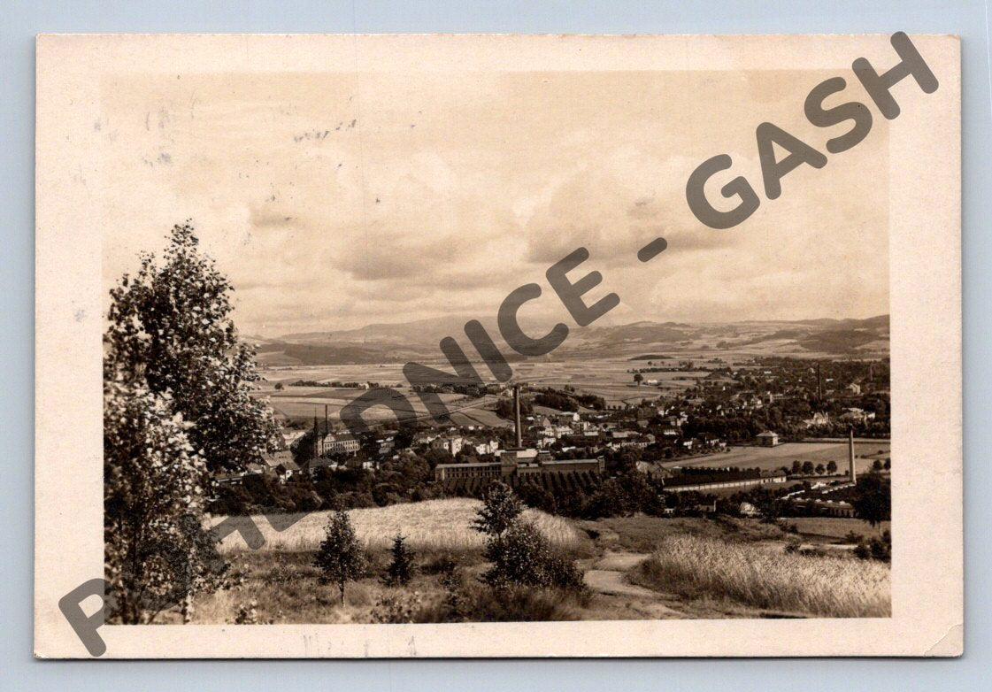 Starobylá pohlednice s pohledem na město Hronov a jeho okolí. Černobílá fotografie zachycuje panoramatický výhled na město s průmyslovými stavbami, kostelem a krásnou krajinou v pozadí. Pohlednice byla vydána nakladatelstvím Ant. Špáta Hronov. Na zadní straně je ručně psaná zpráva, razítko s datací 18. VIII. a poštovní známka v hodnotě 50 haléřů. Jedná se o autentický dobový exemplář v dobrém stavu, vhodný pro sběratele historických pohlednic nebo zájemce o regionální historii.