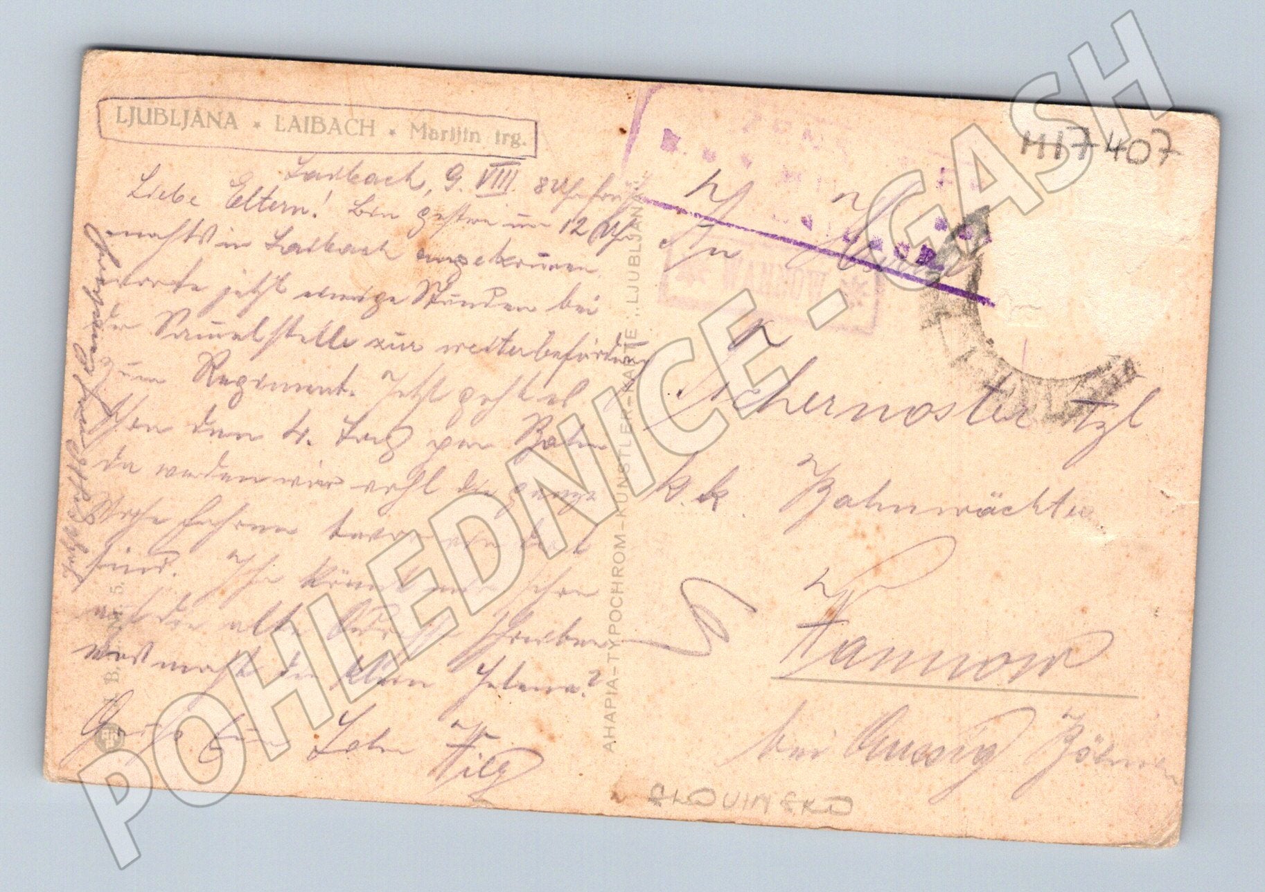 Originální stará pohlednice s kolorovaným pohledem na centrum Lublaně (Ljubljana, Laibach) v dnešním Slovinsku. Na obrázku je zachyceno historické náměstí, elegantní měšťanské domy, kočáry a postavičky v dobovém oblečení. V pozadí je vidět hrad na kopci. Pohlednice byla skutečně zaslána – zadní strana je popsána německy, s dochovanou známkou a razítkem. Celkový stav odpovídá stáří pohlednice, na přední straně drobné stopy po manipulaci, zadní strana je kompletně popsána. Skvělý sběratelský kousek pro milovníky starých evropských měst a historických pohlednic.