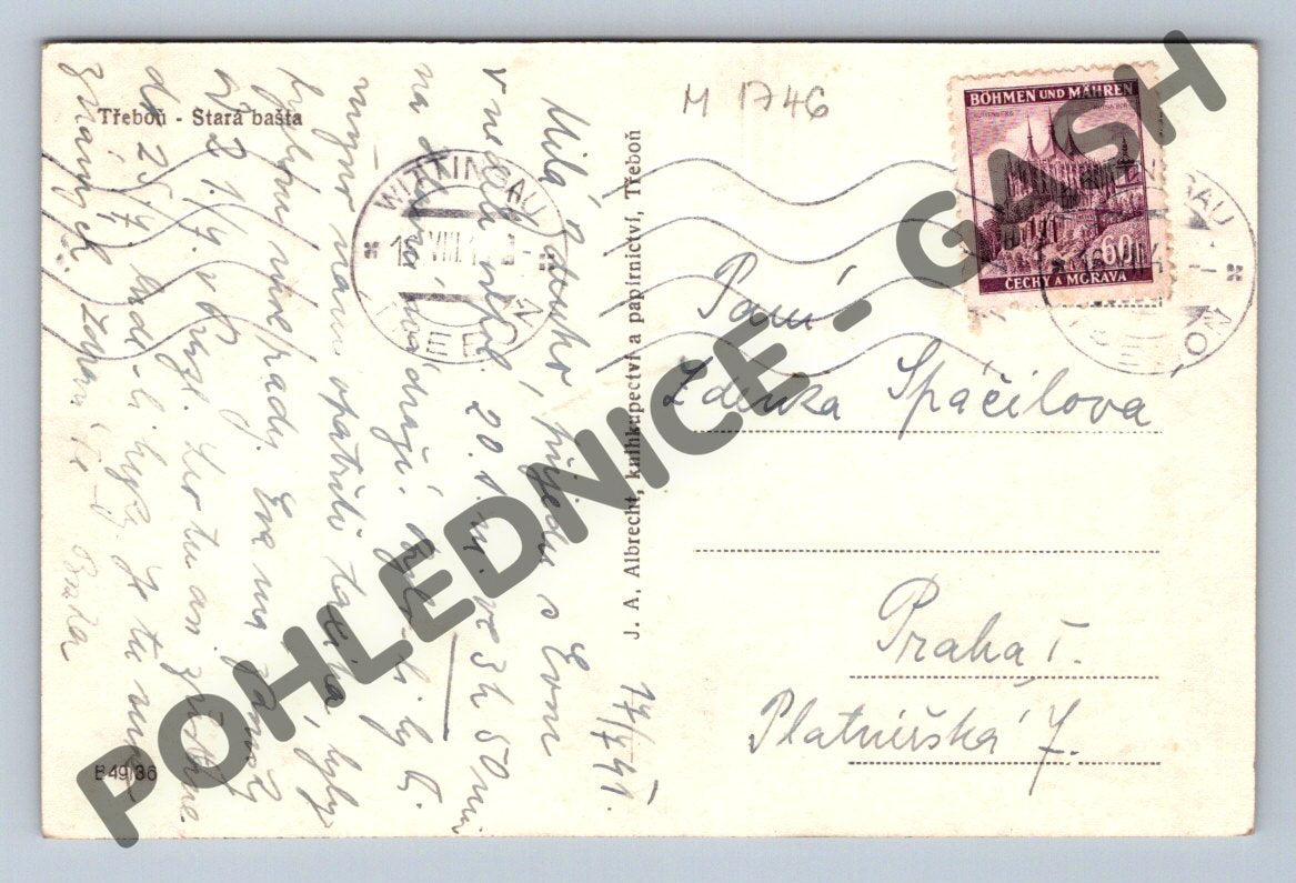 Originální černobílá pohlednice zachycující starou baštu v Třeboni. Na přední straně je vyobrazená historická část městského opevnění při řece. Zadní strana je popsána, s poštovní známkou Böhmen und Mähren a čitelným razítkem. Pohlednice byla odeslaná do Prahy, adresována paní Zdence Pražilové. Výrobce pohlednice: J. A. Albrecht, knihkupectví a papírnictví Třeboň. Krásná ukázka architektury a historie Třeboně vhodná pro sběratele i milovníky regionálních památek. Stav odpovídá stáří, viz foto.