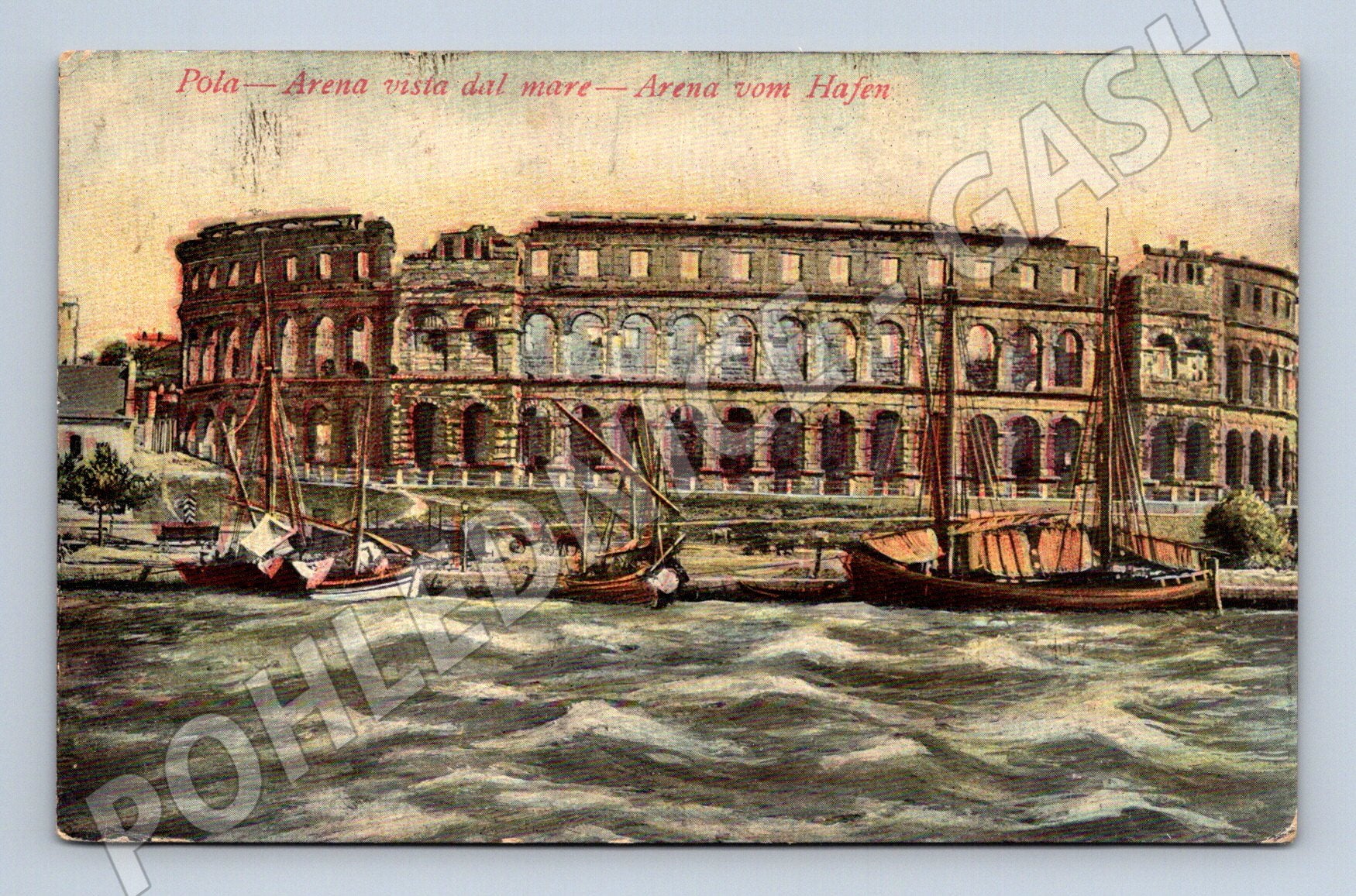 Originální stará pohlednice zobrazující slavný římský amfiteátr v Pule (Chorvatsko), pohled z moře (Arena vista dal mare). Na pohlednici jsou zachyceny i tradiční lodě kotvící v přístavu. Barevná litografická pohlednice, na zadní straně známka a rukopisný text, jakož i razítko. Pohlednice byla vyrobena v Německu a je adresována do Čech (Böhmen). Krásný stav odpovídající stáří, vhodné pro sběratele, milovníky historie a památek nebo jako dekorace.