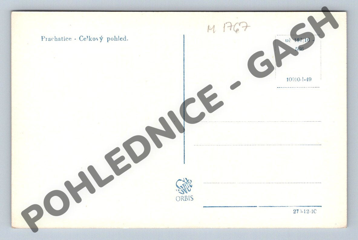 Originální černobílá pohlednice s názvem Prachatice - Celkový pohled nabízí krásný panoramatický výhled na historické město Prachatice a jeho okolní krajinu. V popředí jsou dobře patrné jednotlivé budovy města zasazené do zvlněné krajiny Šumavy. Jedná se o pohlednici vydanou podnikem Orbis, malý formát, zadní strana je nepopsaná, bez známky, číslo tisku 10010-I-49. Ideální sběratelský kousek pro milovníky starých pohlednic a místopisných motivů.