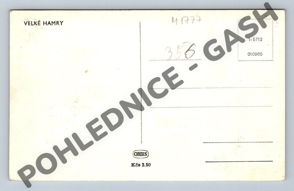 Starší černobílá pohlednice s názvem Velké Hamry. Na pohlednici je zachycena panoramatická krajina města Velké Hamry s výraznou tovární budovou a komínem v popředí. Pozadí tvoří kopcovitá krajina, vesnické domky, kostel a roztroušené lesy. Zadní strana je neprošlá bez textu, s vyznačením místa pro známku, výrobce Orbis, cena 2,50 Kčs. Stav pohlednice je velmi dobrý, pouze drobné známky stáří a opotřebení odpovídající době vzniku. Vhodné pro sběratele historických pohlednic českých měst a obcí.
