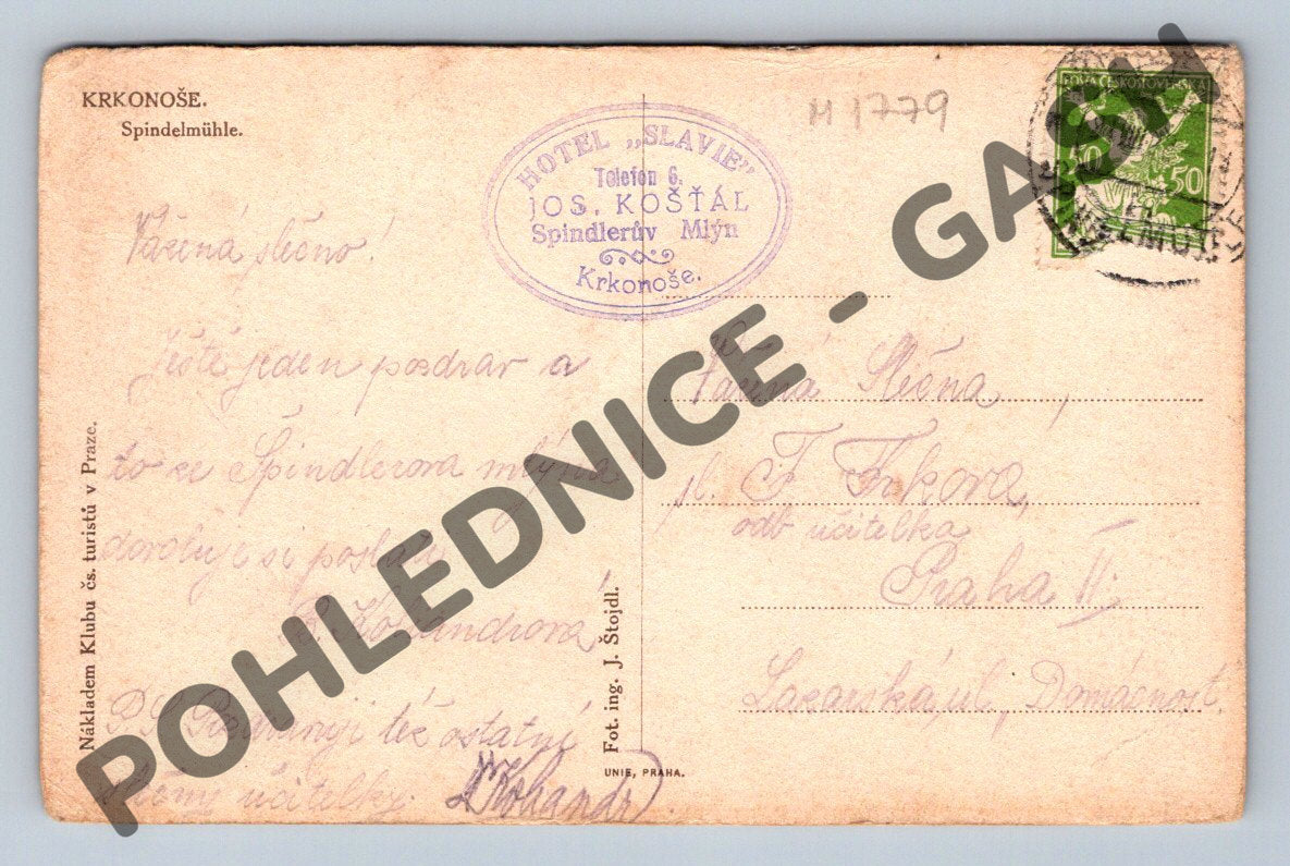 Originální stará pohlednice z období první poloviny 20. století zachycující pohled na obec Špindlerův Mlýn v Krkonoších, tzv. Špindelmühle. Na pohlednici je detailní pohled na horskou krajinu s budovami a vegetací, na zadní straně je ručně psaný vzkaz, hotelové razítko a dobová československá známka. Jedná se o cenný sběratelský kousek dokumentující podobu turistiky a architektury v Krkonoších v minulosti. Pohlednice byla vydána nákladem Klubu českých turistů v Praze, autorem fotografie je Ing. J. Štoidl. Výborný stav odpovídající stáří, drobné známky používání po okrajích.